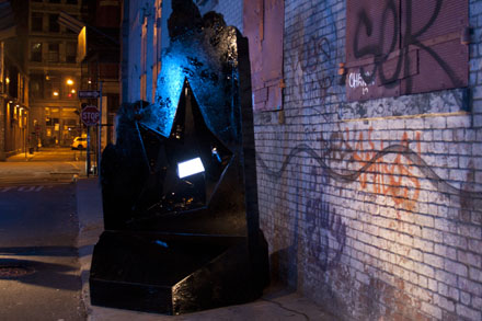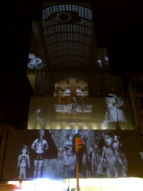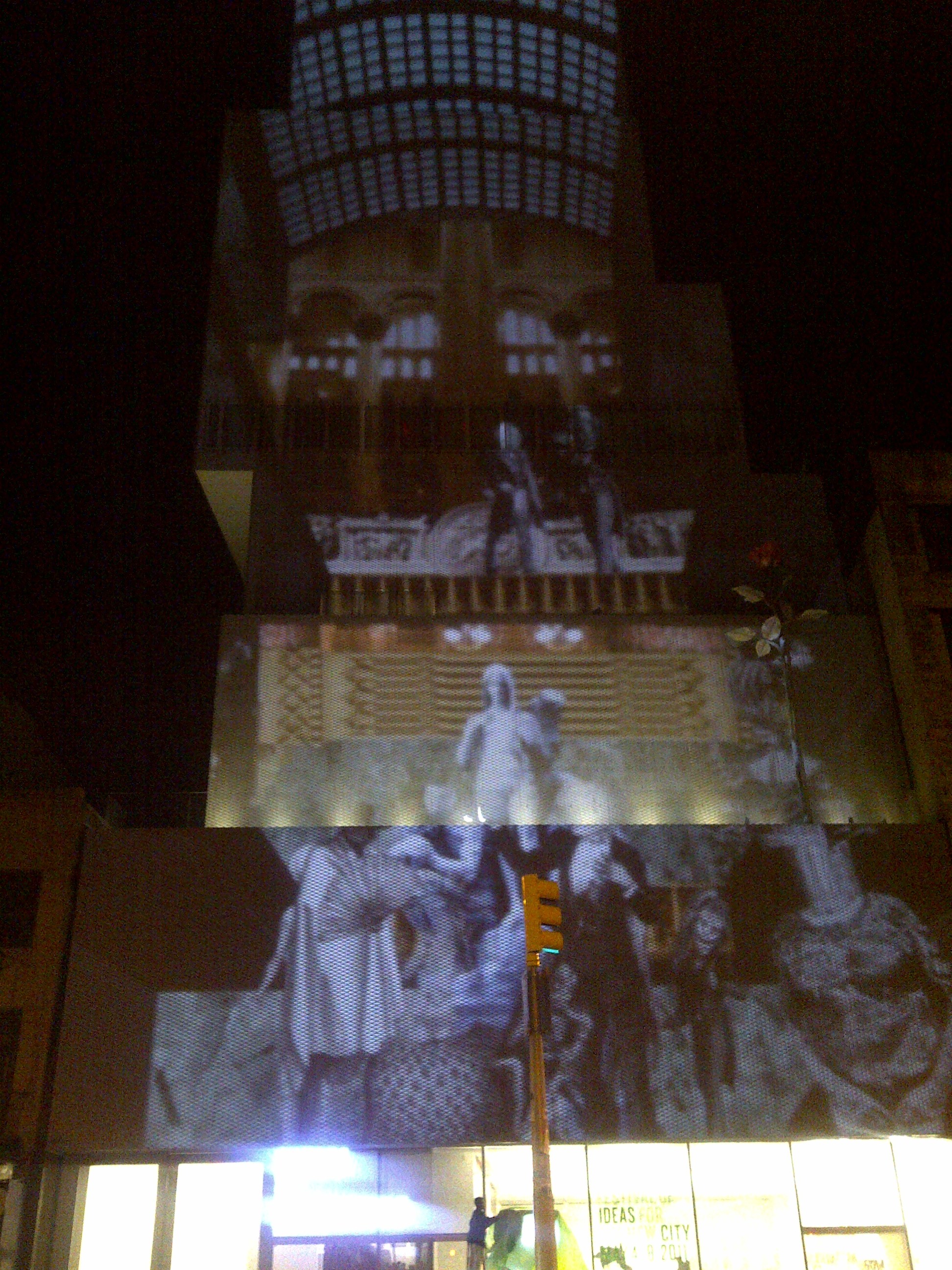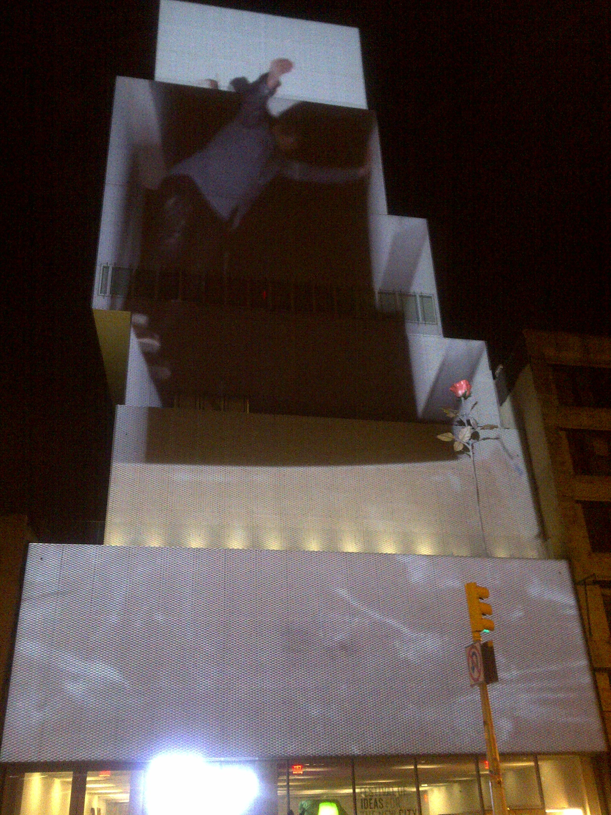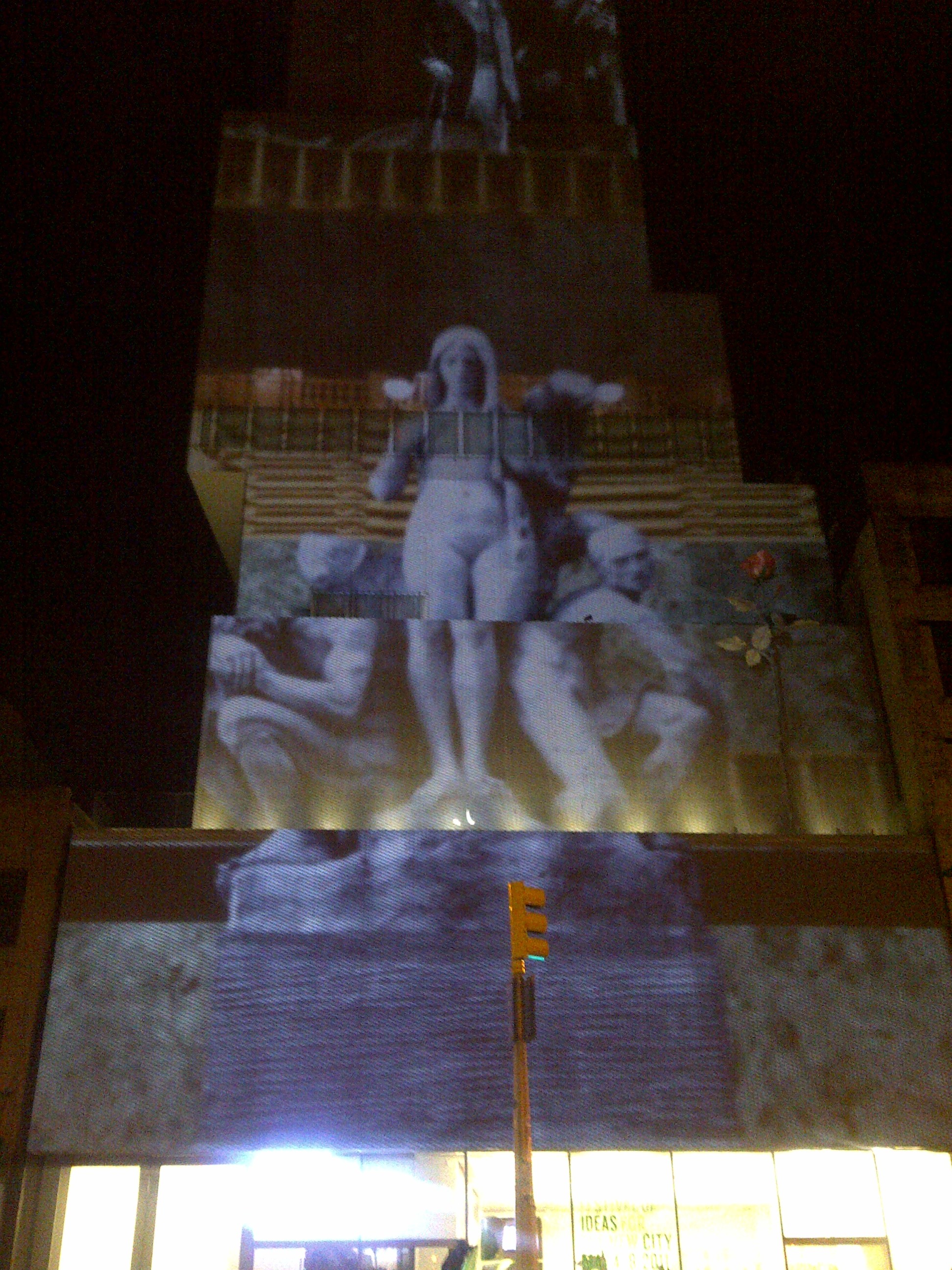 One of the screenings organized by Flash:Light was the premiere of Marco Brambilla’s Civilization in 3D, which took place in the interior of St. Patrick’s Cathedral. This project was originally commissioned by The Standard Hotel, to be installed and played in the elevators. Civilization recontextualizes Dante’s journey through Hell, Purgatory, and Heaven as depicted in The Divine Comedy, by replacing the original tropes with pop mythology. In Civilization, the ascendance path from Hell to Heaven turns out to be a sardonic cycle, where salvation and damnation are perpetually above and below each other. The whimsical categorization of imagery–whether who or what belongs to which level–leaves room for a lot of interpretations, most of them irreverent. The fact that such a spectacle took place in a Cathedral, brings notions on the success of Nuit Blanche’s curatorial efforts, as they drew the possibility of an interesting dialogue between the visual artwork and the ideological space that contained it.