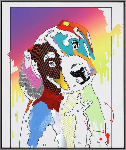 Reyle showcases work in various mediums, but the focuses on paintings, which imitate the recognizable children’s paint-by-numbers game, a motif of Reyle’s less known than his ‘foil-paintings’ or more abstract pieces. In the paint-by-numbers works, the black lines of the painting delineate the form that underlies the picture, such as in “Little Cody” (pictured), where the underlying form of a dog is barely recognizable through the clashing colors and patterns. As is characteristic of Reyle’s tongue-in-cheek approach, some of the areas that would normally be filled in still reveal their “paint-by” numbers. In those spaces, Reyle has used different methods of paint application than continues throughout the rest of the piece. The artist has also produced some abstract paint-by-numbers paintings which are enlarged sections the figurative works. In both cases, Reyle adds his signature, a splotch with some runny drops of paint.