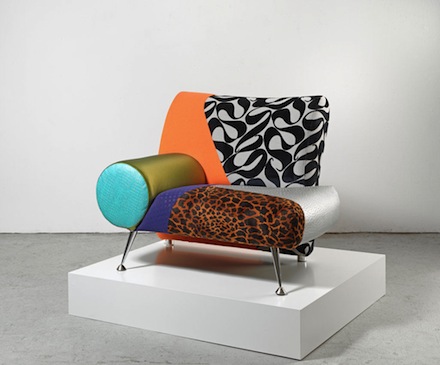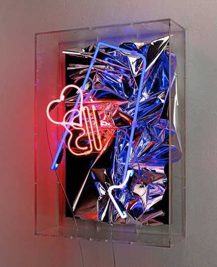 The show also presents three foil-neon pieces, with Reyle’s familiar use of rippled foil, and sofas (of which there are five), which have been produced as an engagement with the Italian design group Memphis. The sofas are made from an agglomeration of garish fabrics, and are set on pedestals.
