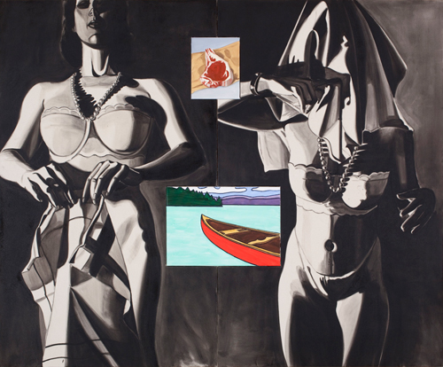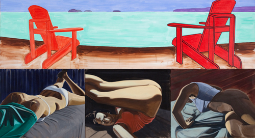 David Salle that appropriate anecdotes from the 19th century river scenes of George Caleb Bingham. Salle includes a prominent and recurring image of an empty canoe or raft drifting alone amidst quiet waters, with vibrantly colored monochrome Adirondack chairs appearing always empty and face out towards the water as if to appreciate the view.