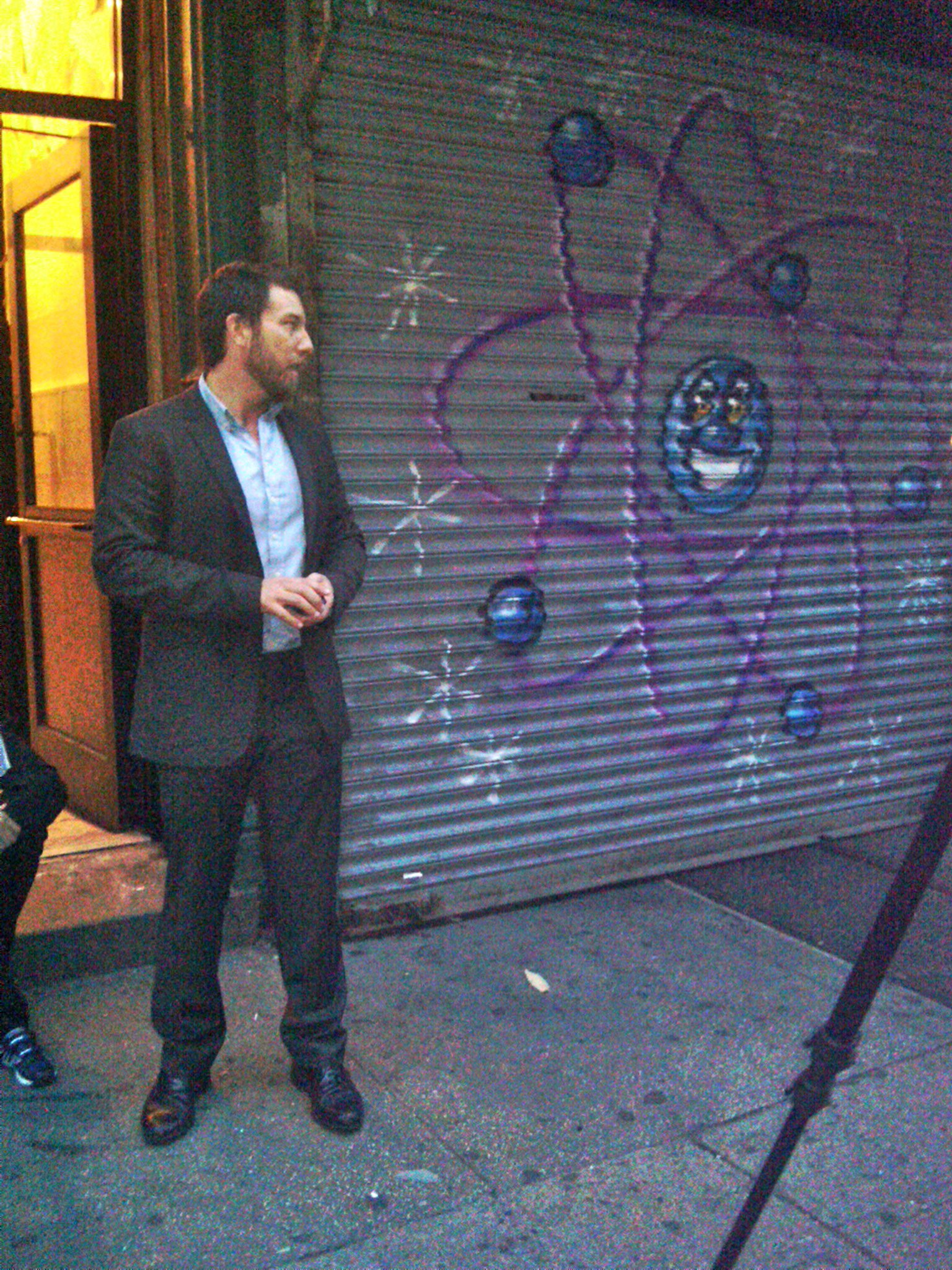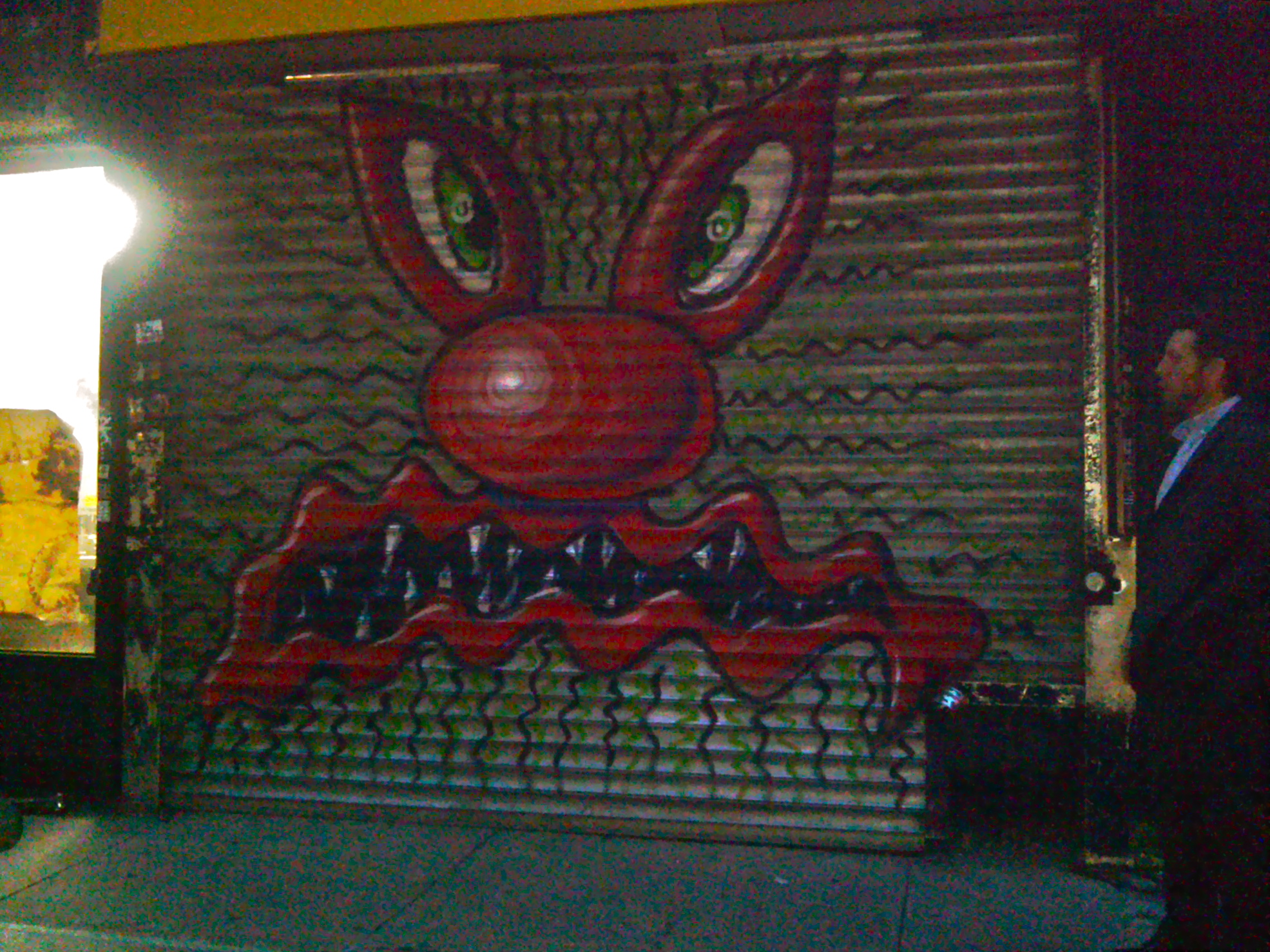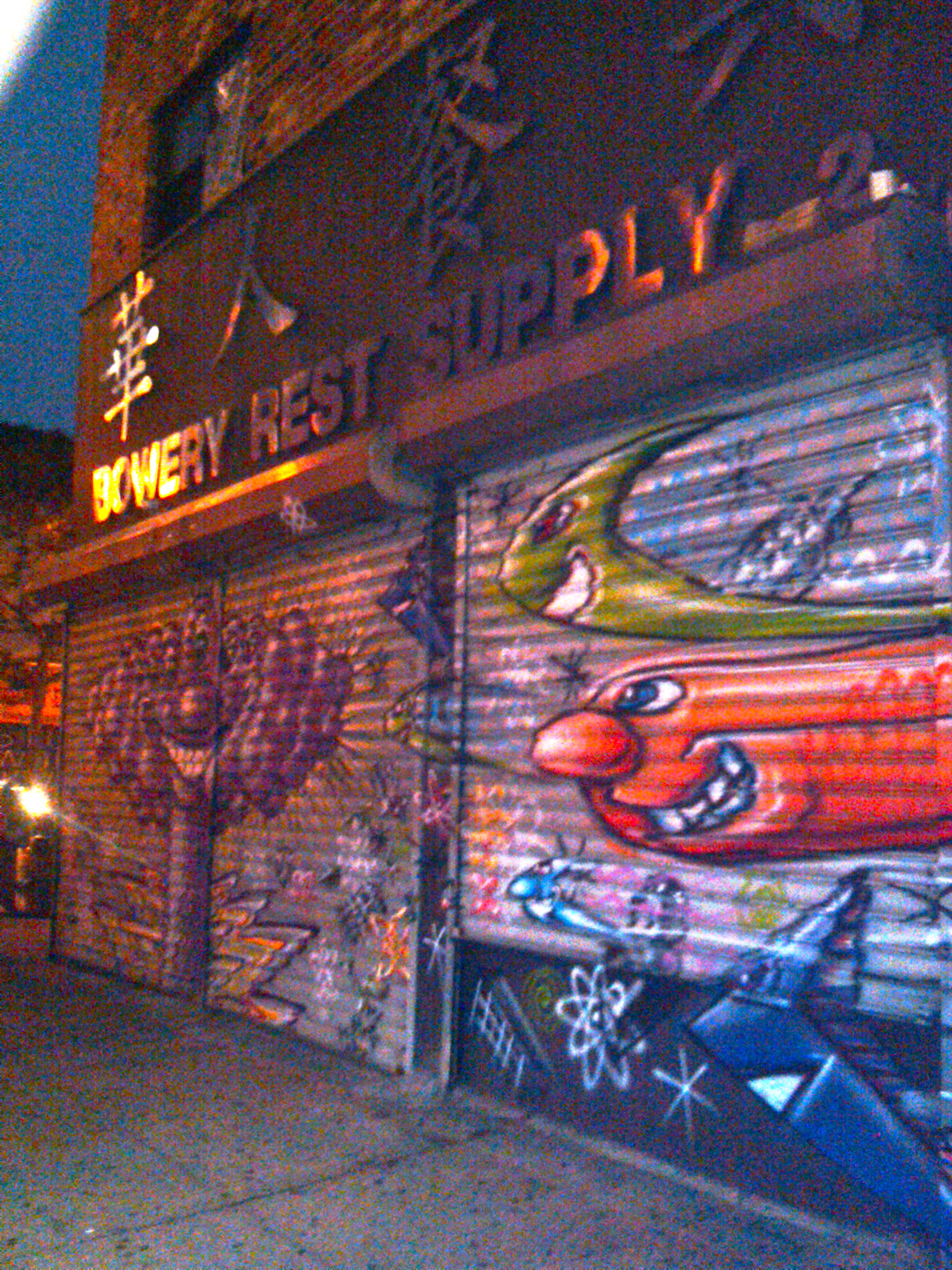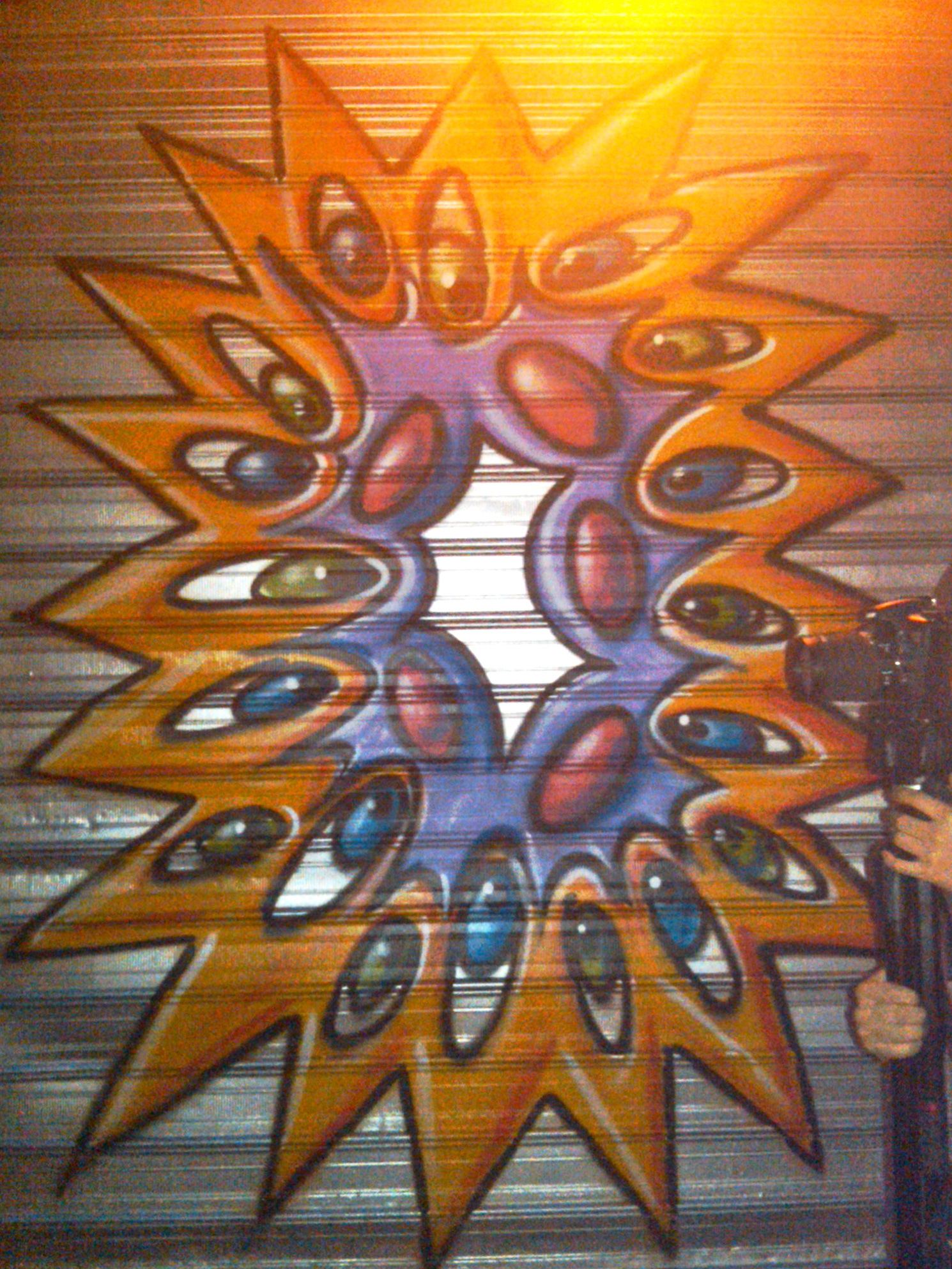 In his latest endeavor, maverick graffiti artist Kenny Scharf has launched a project entitled “The Gates Project” produced in part by Anonymous Gallery.  In the project Scharf will paint roughly 100 roll-down storefront gates focused in the burgeoning Lower East Side.  Boldy painting in the middle of daylight, Scharf has already completed murals at 2 Delancey street, 132 Orchard street and most recently, a massive mural stretching for blocks on the Bowery. Scharf is teaming up with Anonymous Gallery for the project, and getting permits for each of the spaces he paints on. Art Observed was lucky enough to have the chance to take a pedi-cab tour of the lower east side visiting each location of Scarf’s work, led by Anonymous director Joseph Ian Henrikson.