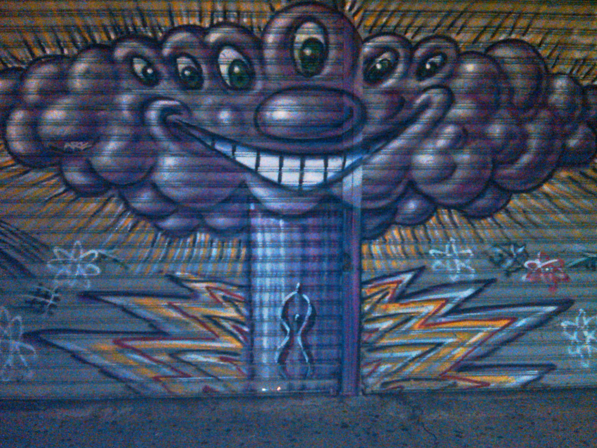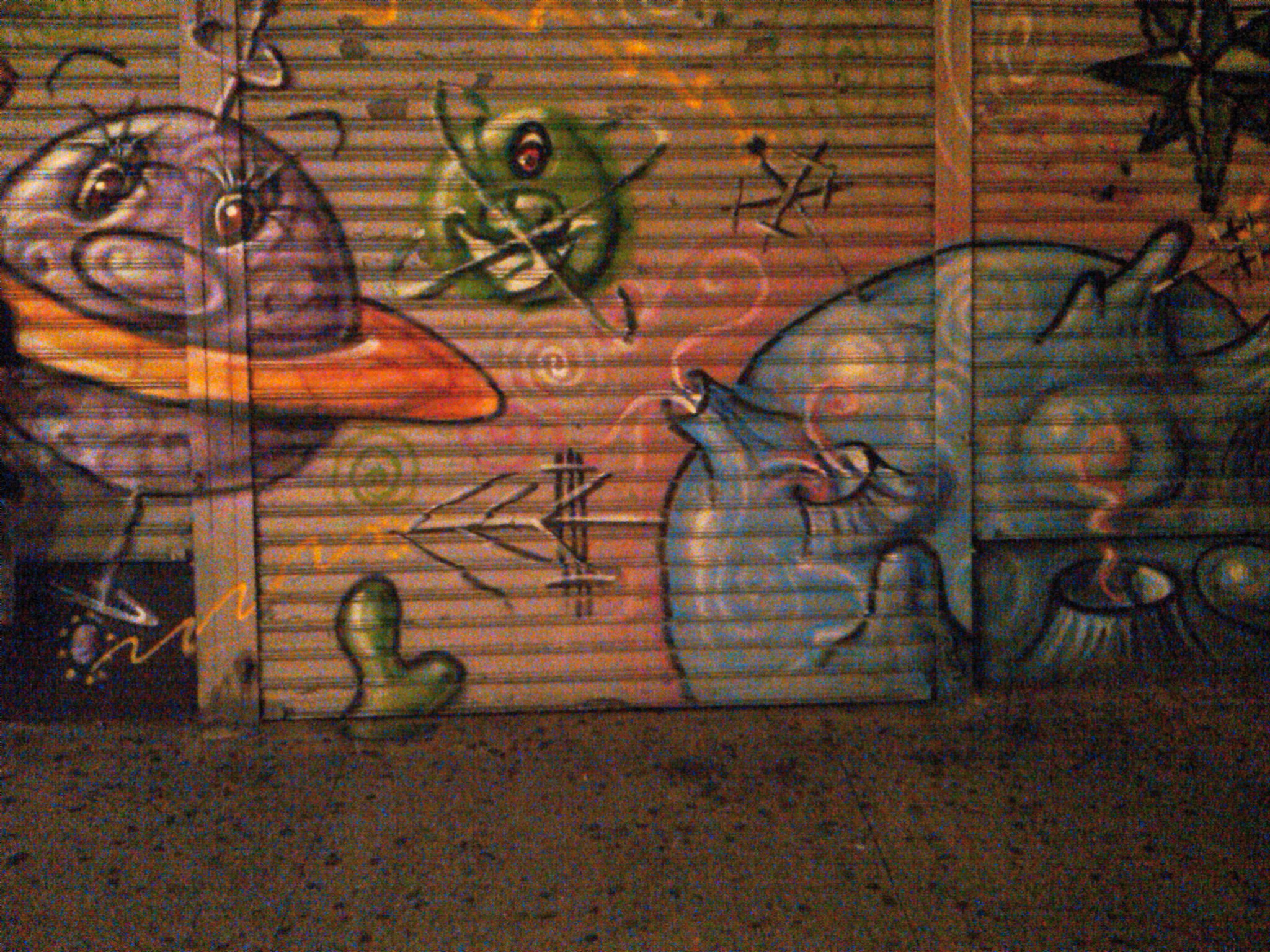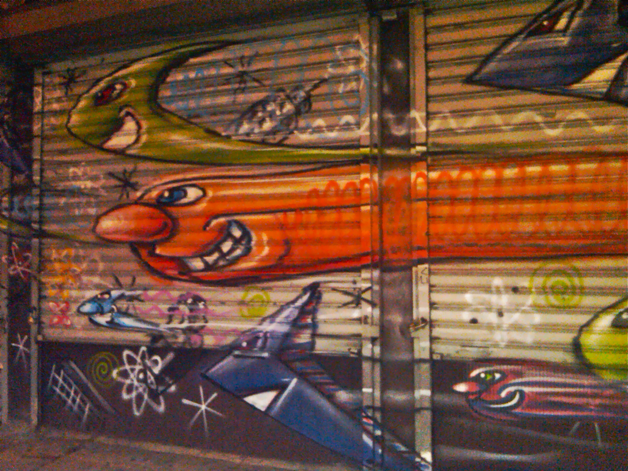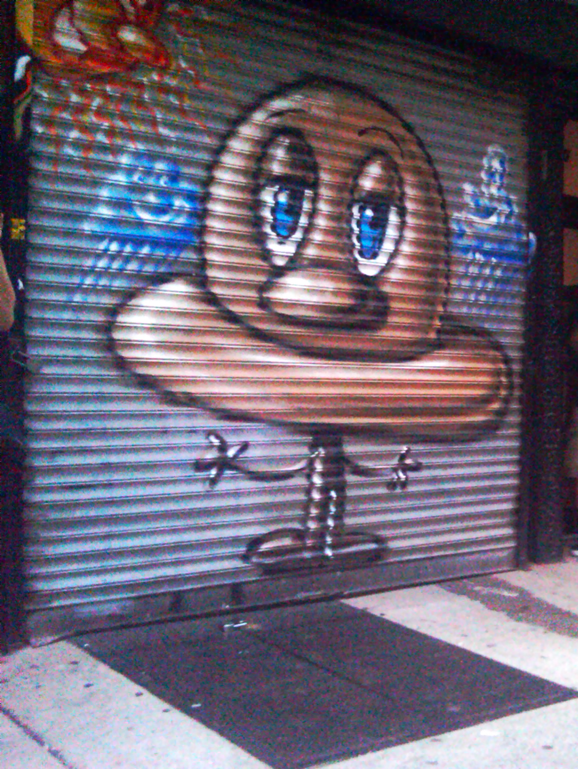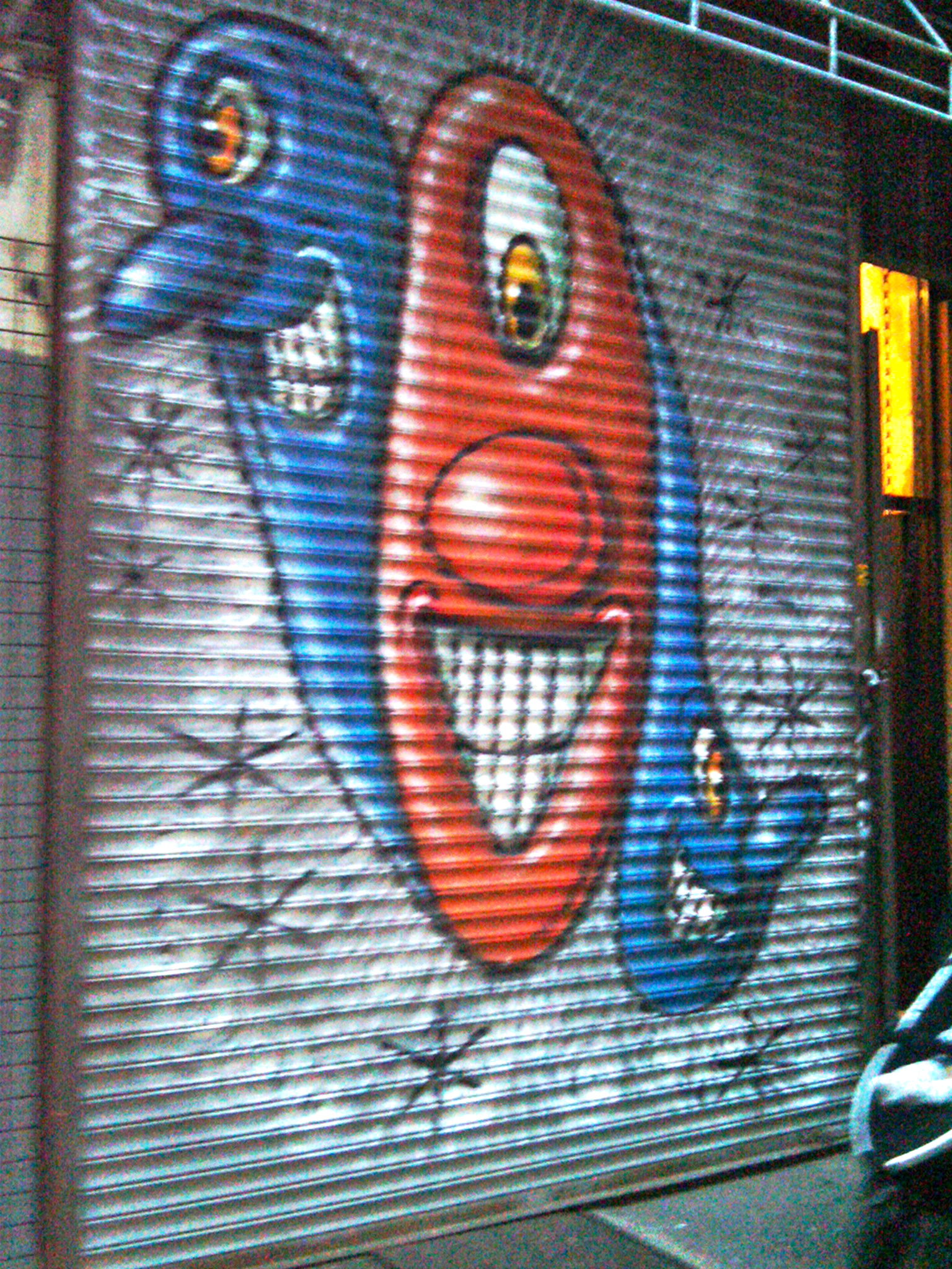 In his latest endeavor, maverick graffiti artist Kenny Scharf has launched a project entitled “The Gates Project” produced in part by Anonymous Gallery.  In the project Scharf will paint roughly 100 roll-down storefront gates focused in the burgeoning Lower East Side.  Boldy painting in the middle of daylight, Scharf has already completed murals at 2 Delancey street, 132 Orchard street and most recently, a massive mural stretching for blocks on the Bowery. Scharf is teaming up with Anonymous Gallery for the project, and getting permits for each of the spaces he paints on. Art Observed was lucky enough to have the chance to take a pedi-cab tour of the lower east side visiting each location of Scarf’s work, led by Anonymous director Joseph Ian Henrikson.