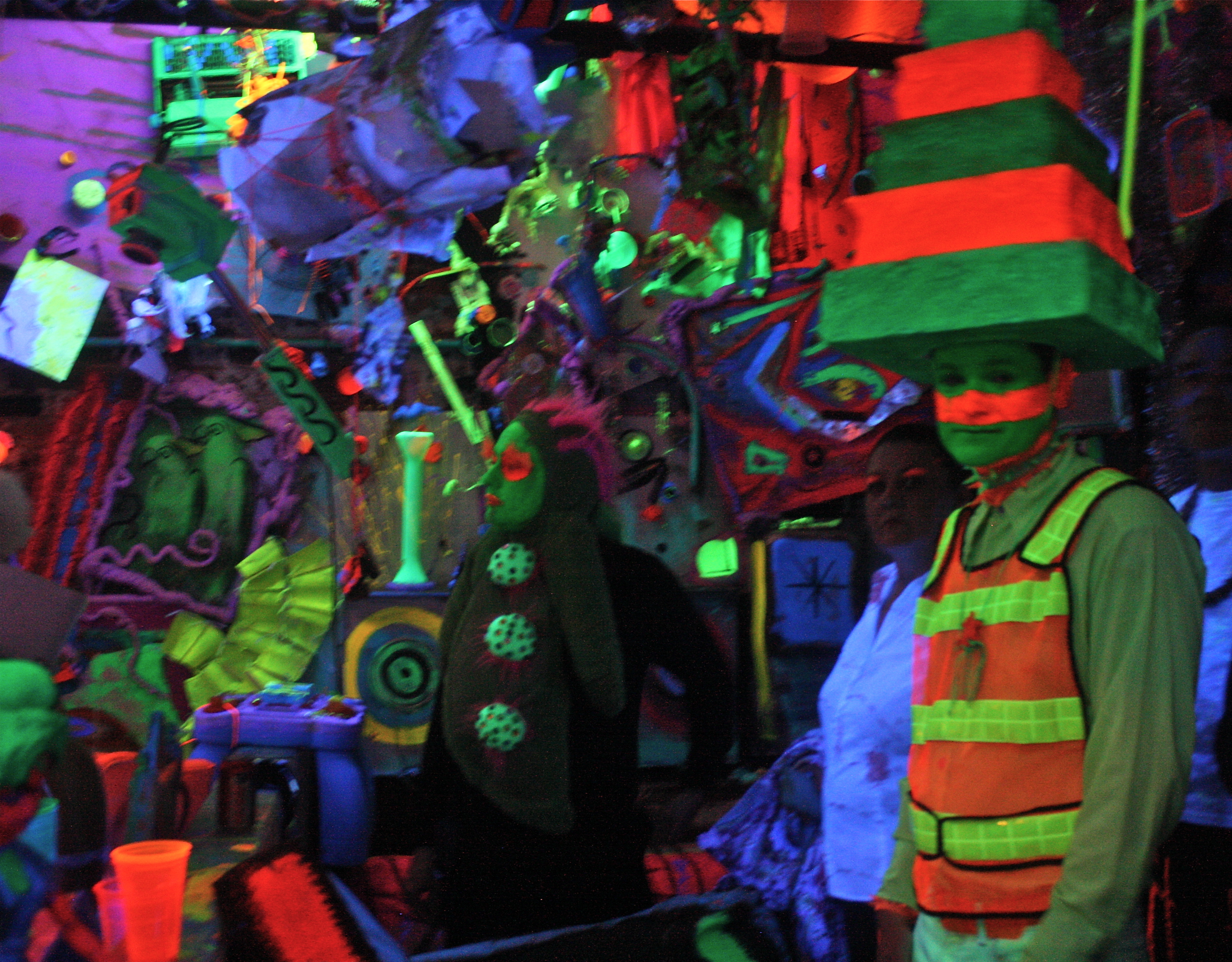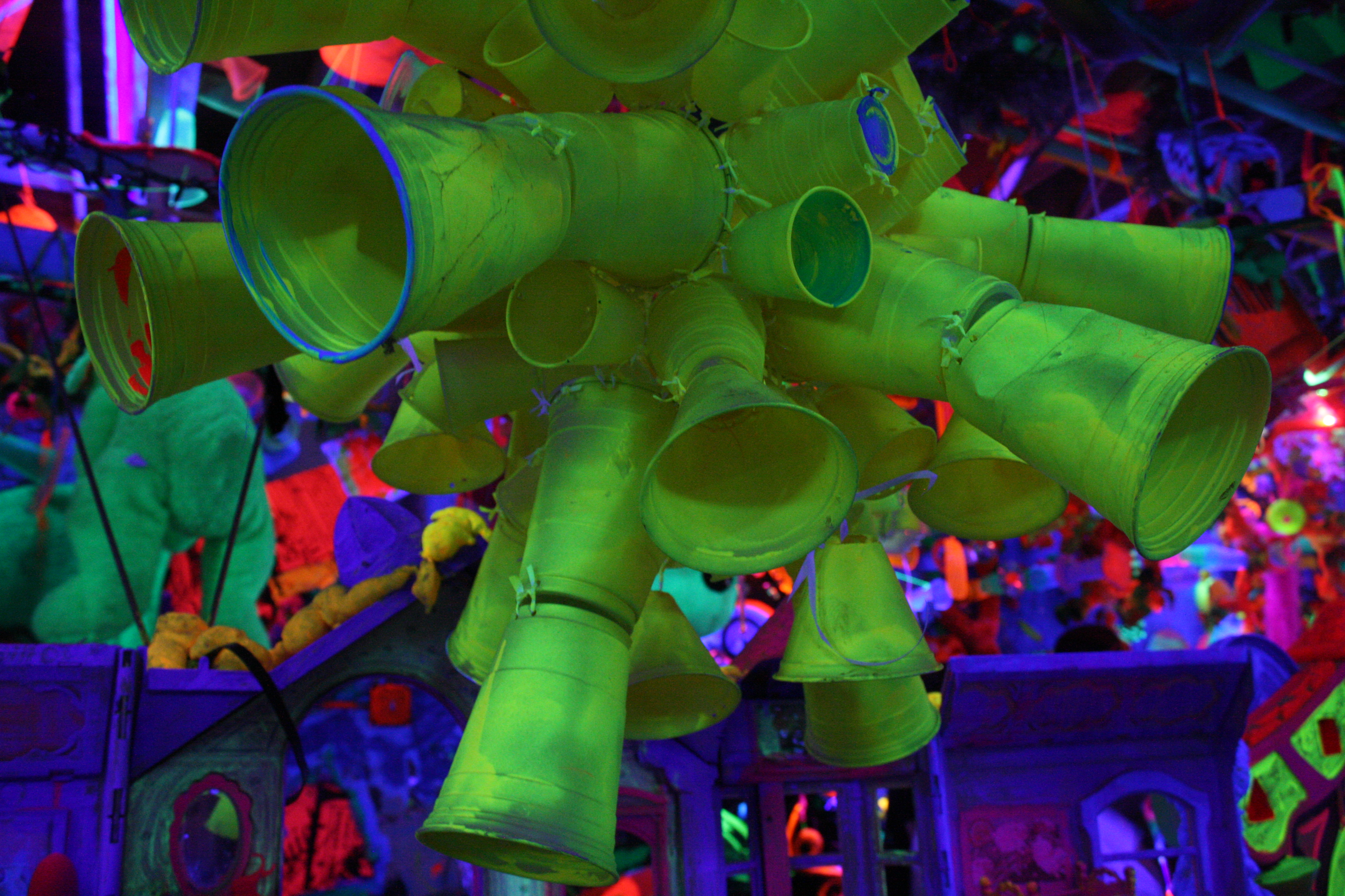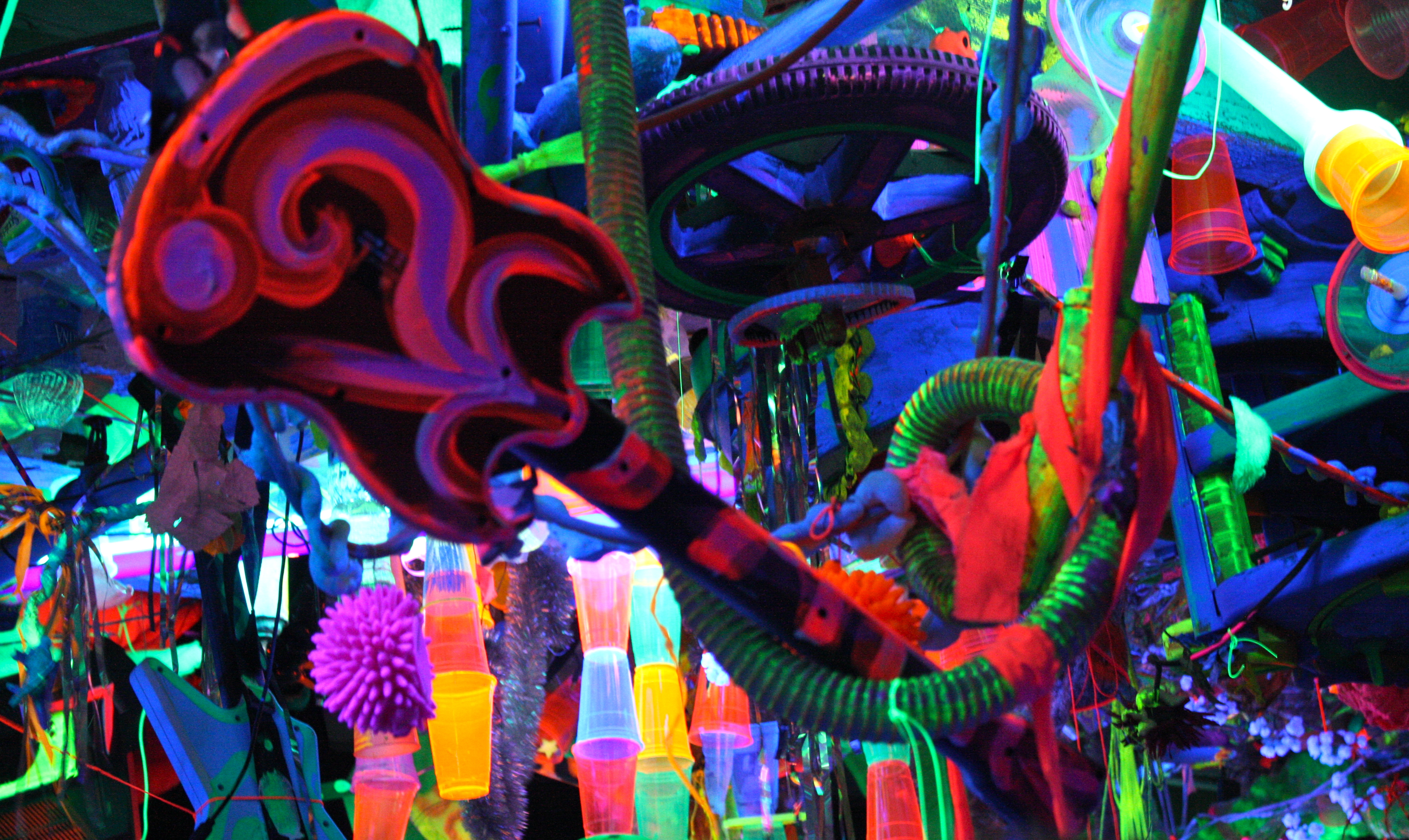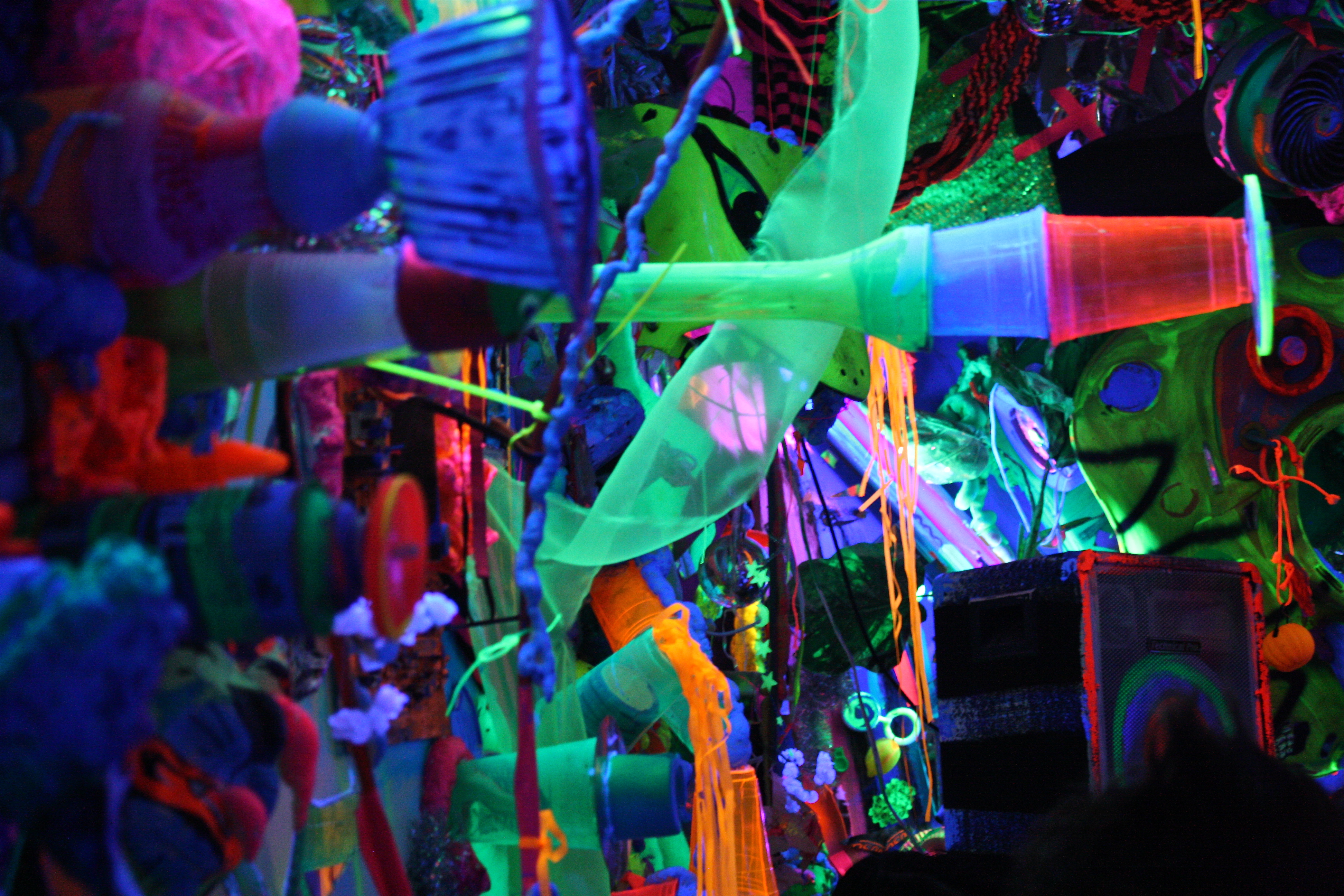 In a recent interview with Art on Air Radio, Kenny Scharf explanis how the now-infamous “Cosmic Cavern” parties got their start in the 80’s. Scharf was living with Keith Haring in a walk-up in Times Square. After clearing out a closet in the apartment, he found various black-lights and decided to create a cosmic “enviroment” inside the closet.  His party on Friday took place beneath his studio in Brooklyn for the first time in more than a year, in a basement filled with all sorts of neon and day-glo covered found objects and trash.