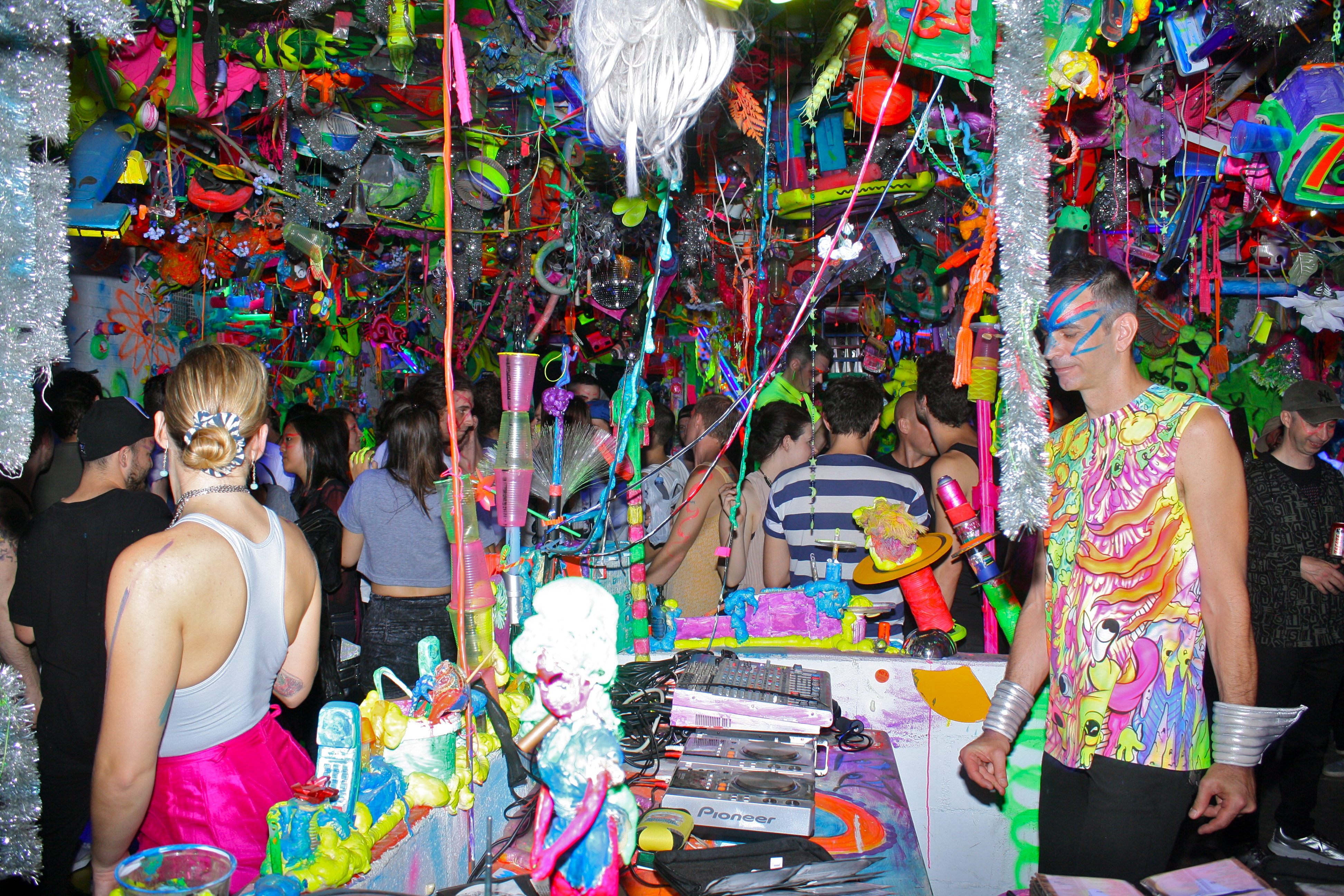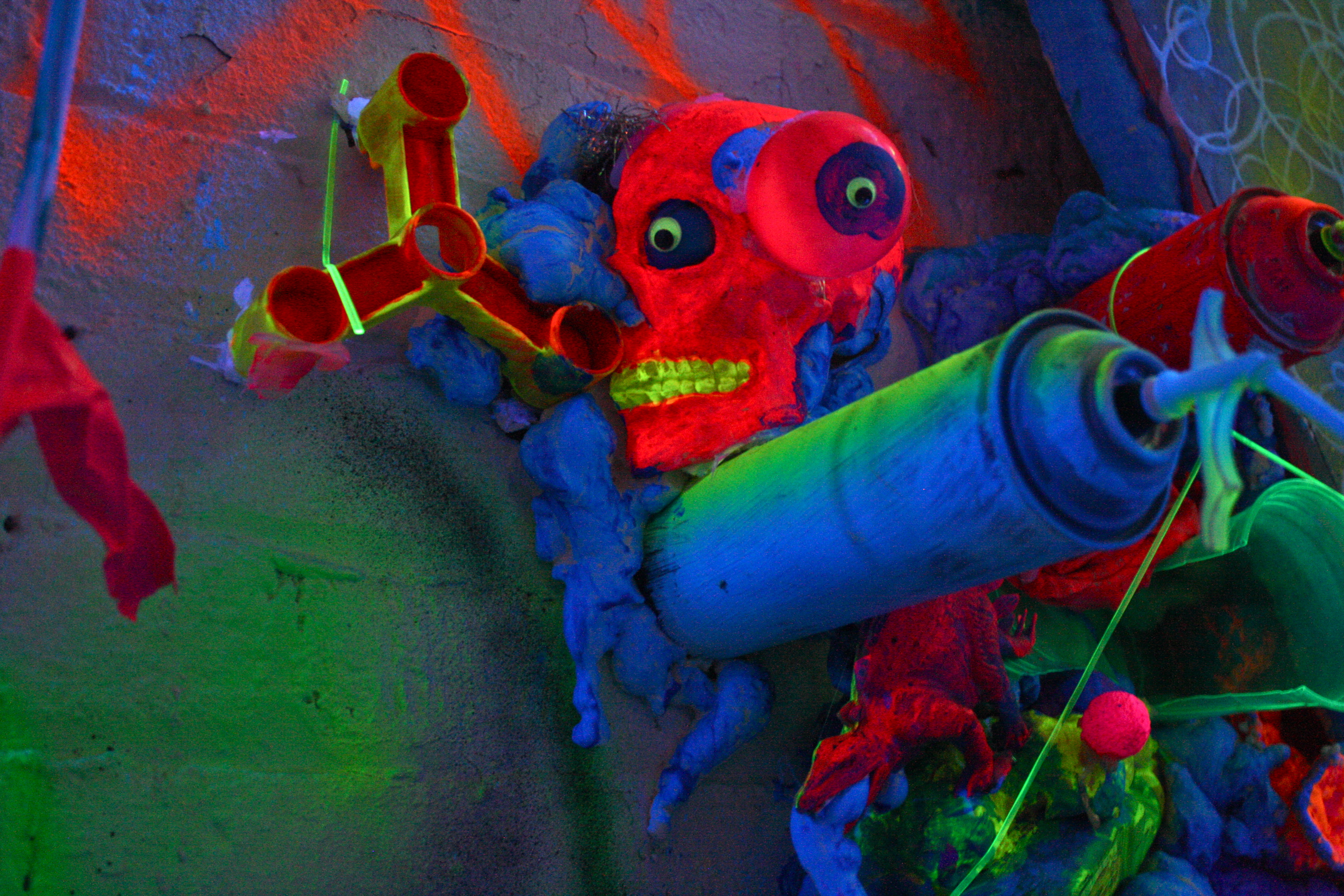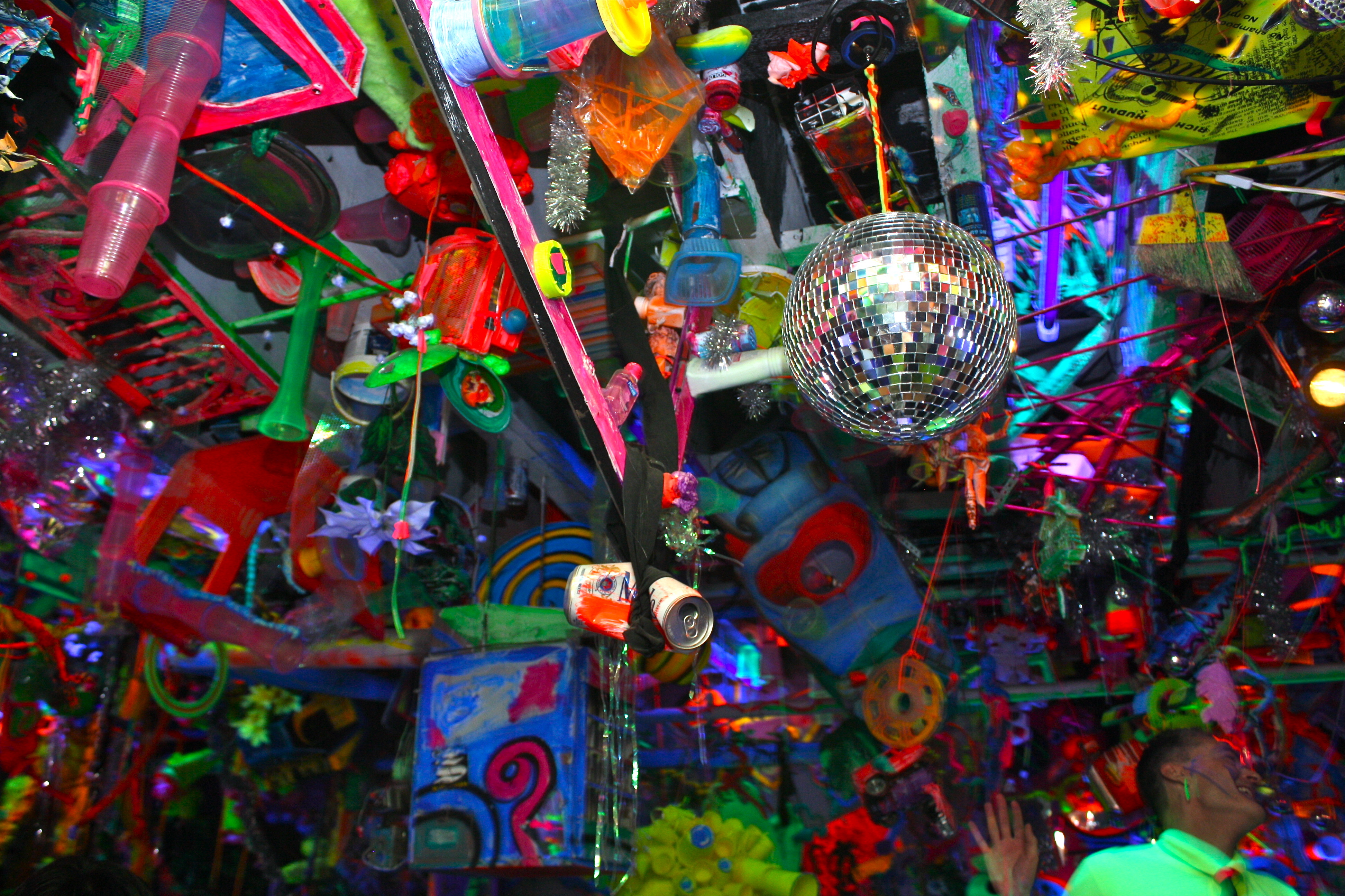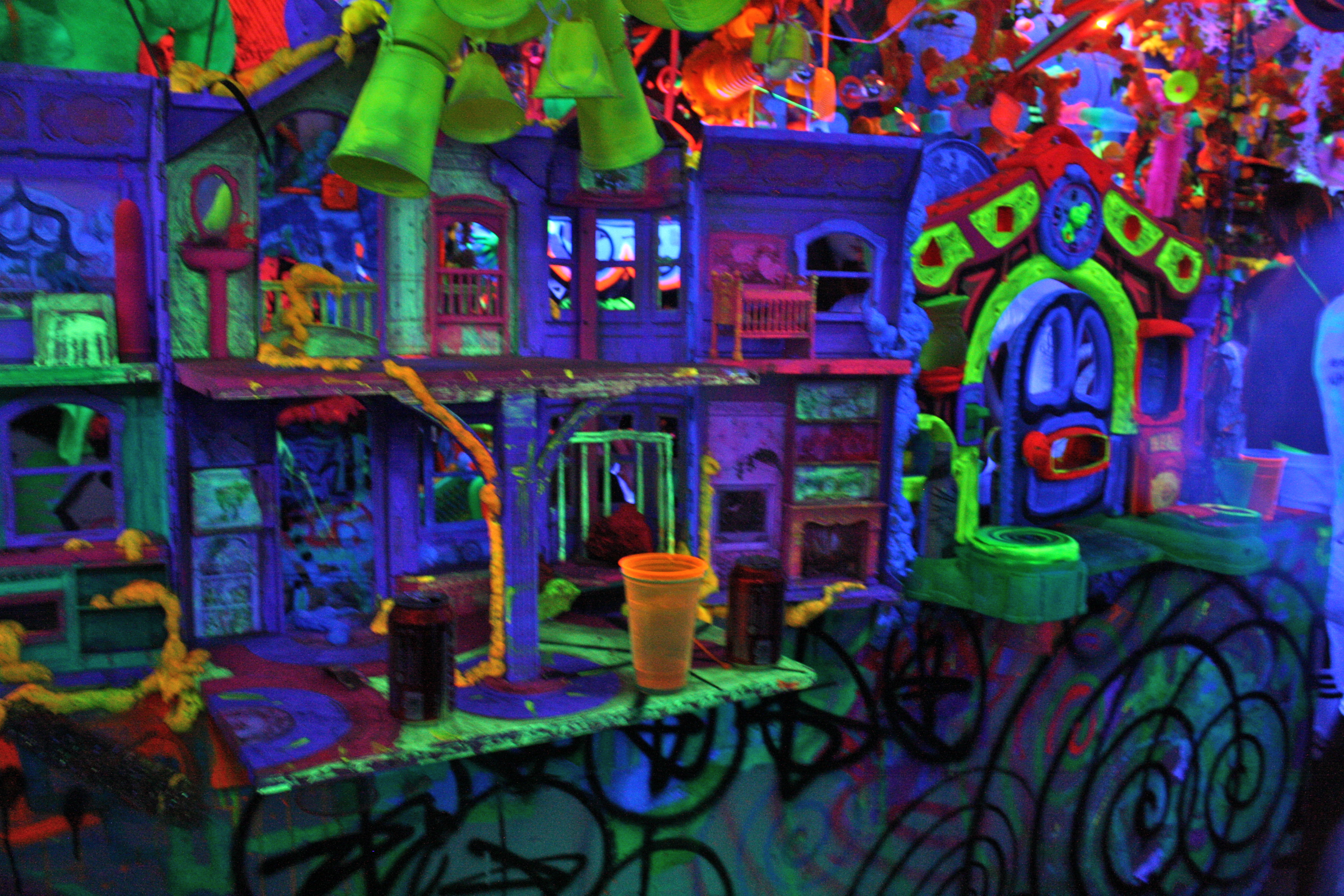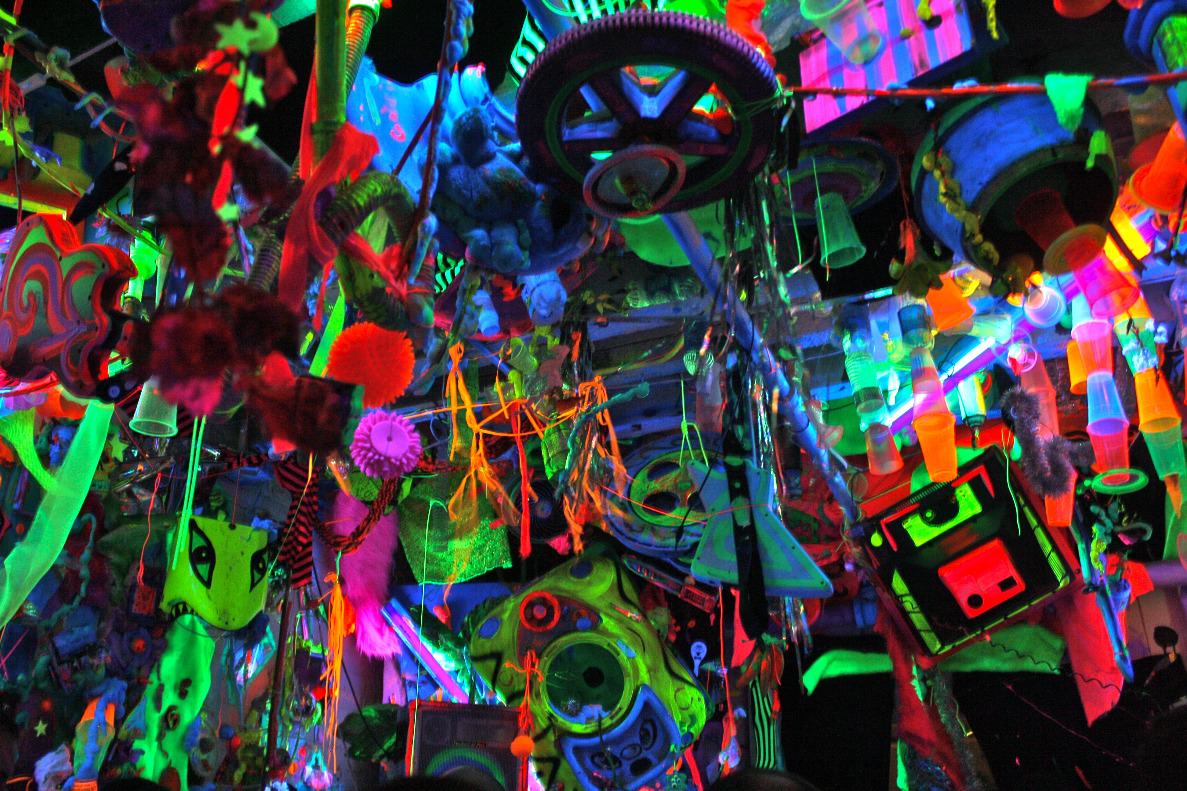 In a recent interview with Art on Air Radio, Kenny Scharf explanis how the now-infamous “Cosmic Cavern” parties got their start in the 80’s. Scharf was living with Keith Haring in a walk-up in Times Square. After clearing out a closet in the apartment, he found various black-lights and decided to create a cosmic “enviroment” inside the closet.  His party on Friday took place beneath his studio in Brooklyn for the first time in more than a year, in a basement filled with all sorts of neon and day-glo covered found objects and trash.