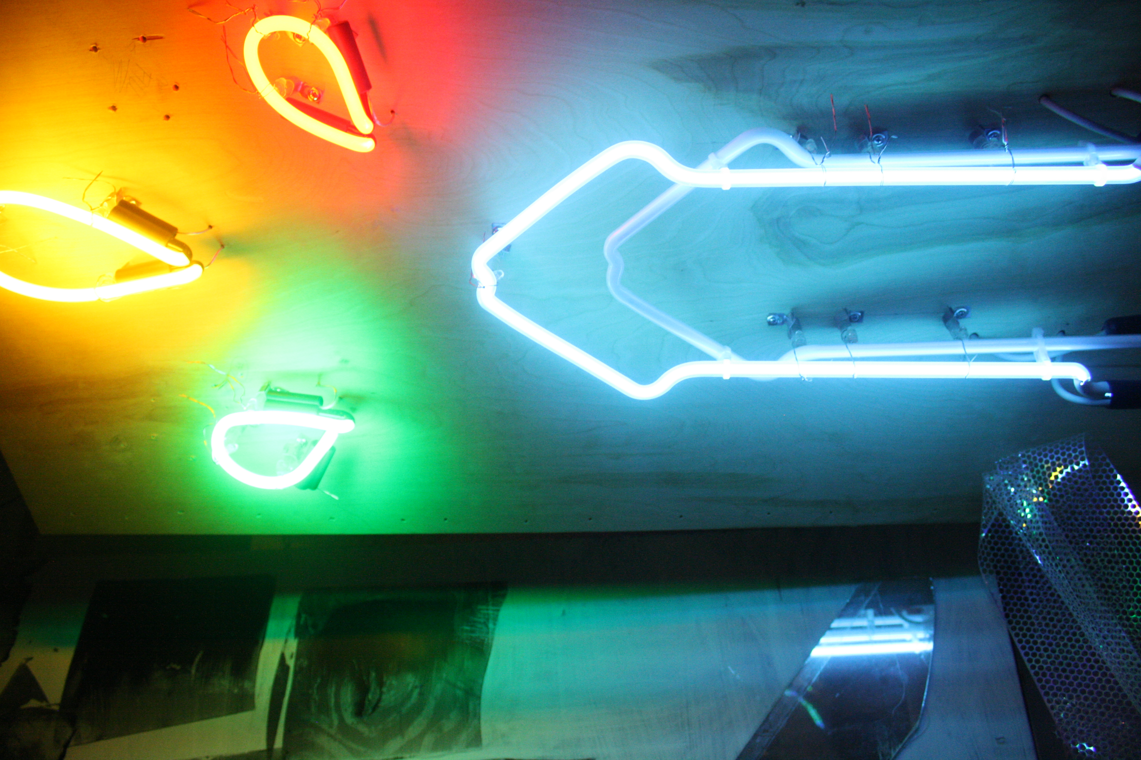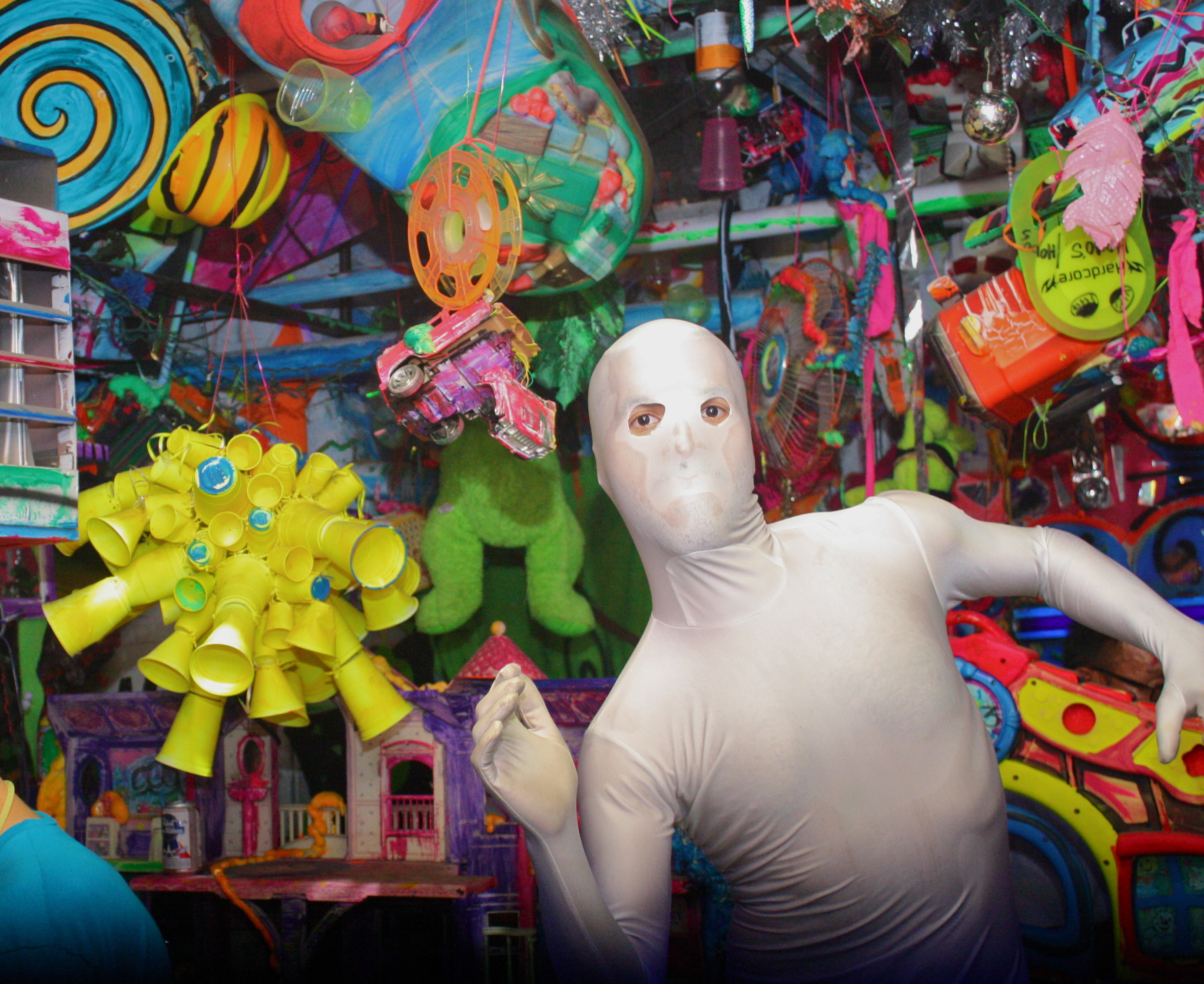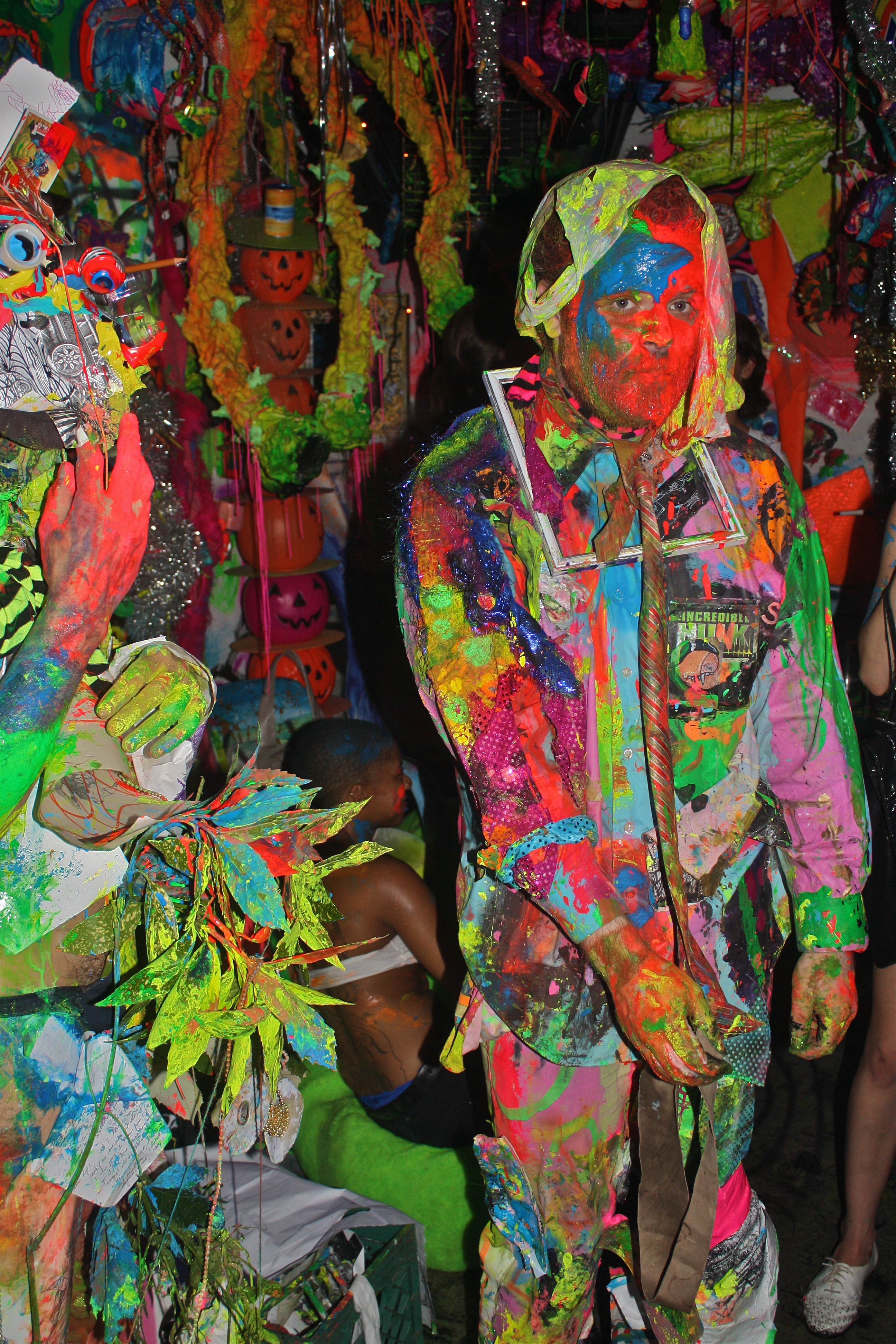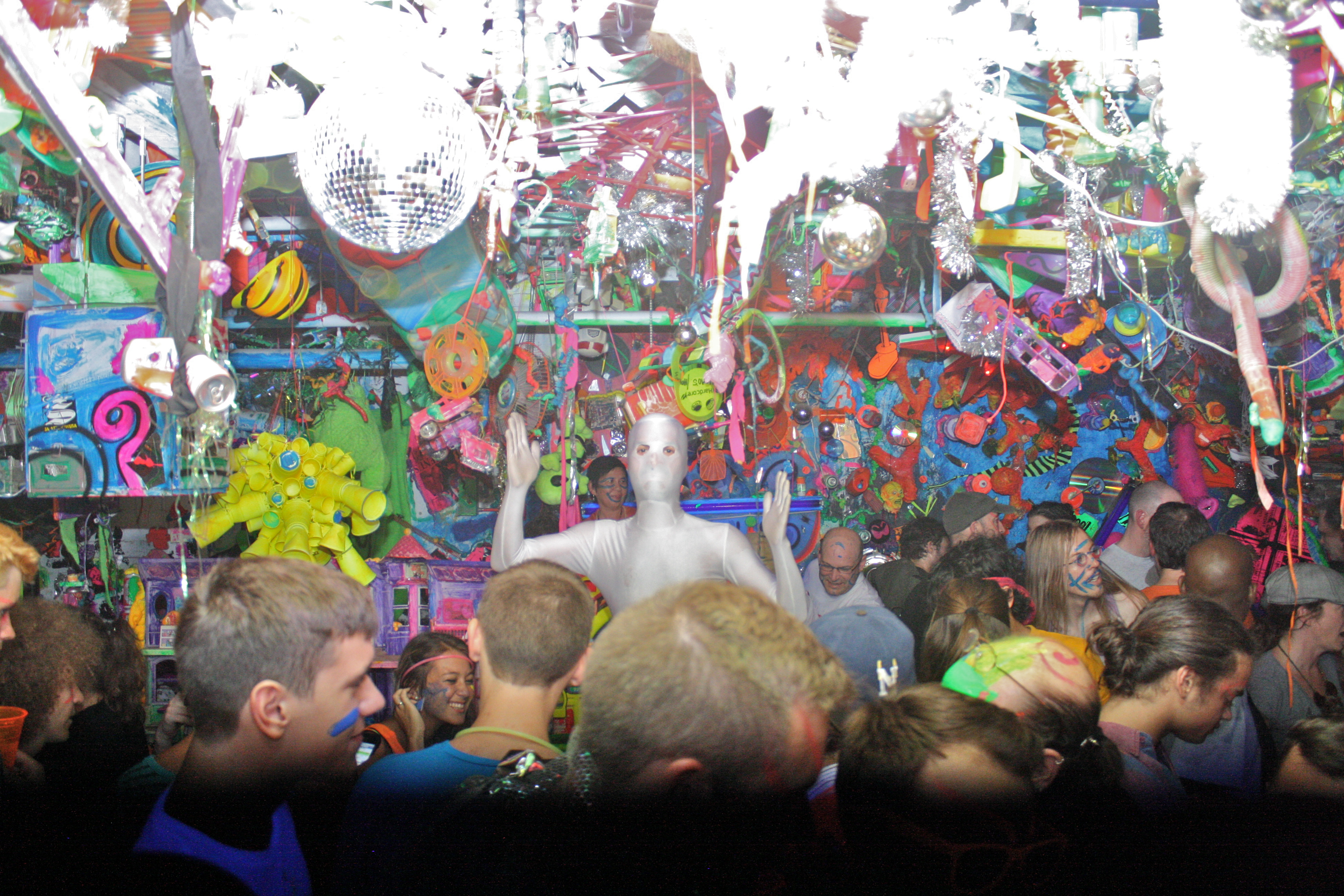 In a recent interview with Art on Air Radio, Kenny Scharf explanis how the now-infamous “Cosmic Cavern” parties got their start in the 80’s. Scharf was living with Keith Haring in a walk-up in Times Square. After clearing out a closet in the apartment, he found various black-lights and decided to create a cosmic “enviroment” inside the closet.  His party on Friday took place beneath his studio in Brooklyn for the first time in more than a year, in a basement filled with all sorts of neon and day-glo covered found objects and trash.