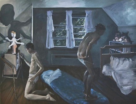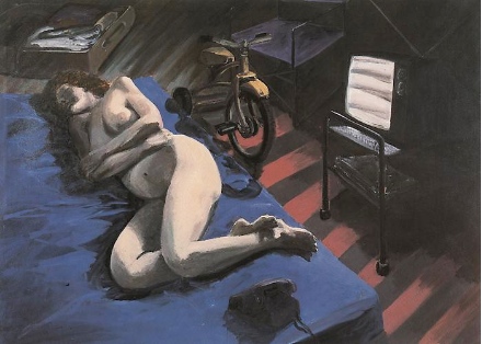 The scenes depicted by Fischl contain a sense of tension, created by the actions of and between the figures within. In “Slumber Party” a young boy and girl prepare for bed. Both are topless and the girl is in the process of removing her underwear. The boy has his back to her, involved in the television. The viewer could be looking at an innocent bedtime ritual, but the children’s nudity adds an edge that make the setting feel darker.
