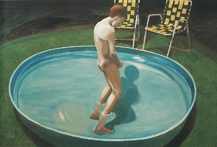 Painted in an Expressionist style, the nine paintings give off an idyllic feeling with their palette—the colors invoke memories of childhood and summertime. The paintings feel and act as if snap shots, capturing a moment. The figures in the paintings are in mid-action. We see them bending, stretching, looking. Fischl has captured the natural movement of the body by way of shadow and depth.