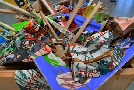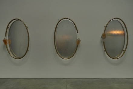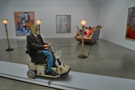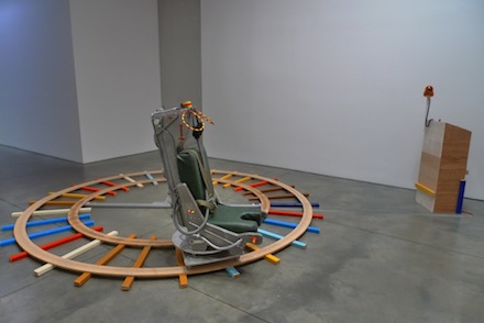 In the rear gallery an ejection seat is reimagined as a circular, gyroscopic chair along a colorful track. Although connected to power and an additional control podium, the piece apparently does not run its circular path for visitors. Emanating an outmoded functionality, the piece now appears both evacuated and vaguely sadistic. Greeting gallery visitors is an electric wheelchair holding a resin-cast figure of the artist. As it sits immobile on a gray track, the installation evokes notions of geriatric lifestyles and an uncertain artistic handicap. Heavy Bruschi is a heap of destroyed works on canvas, originally created by the artist’s assistant only to be presented in such a skewed fashion. Like the indistinguishable nature of the shredded canvas paintings, Mirror for Hang Over Bud similarly presents an ironic purpose. Three oval mirrors hang together for the viewer to examine, although their surfaces are of aluminum foil rather than glass, thus preventing one from seeing anything but a ghostly reflection.