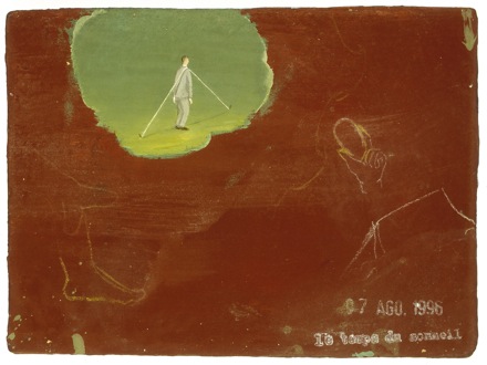 Profuse with video and somewhat mired by the aforementioned “back story” materials, ‘A Story of Deception’ is punctuated by a smattering of paintings which bring welcome equilibrium to this exhibition. Most notable of these is Le Temps du Sommeil (1996―present) at MoMA. An ongoing series of more than 100 small canvases— approximately 4.3 in. x 6 in. each—Le Temps du Sommeil is meant to serve as an evolving record of the artist’s visual ideas that have developed from actions or preceded them.