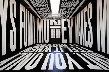 The West Gallery features massive white letters emblazoned across a black background and wrapped around the entirely of the space including walls, ceiling, and floor.  Being fully immersed by text, the viewer is forced to grapple with slogans such as “MONEY IS LIKE SHIT YOU ONLY FEEL IT WHEN IT MOVES” and “ALMOST FAMOUS, ALMOST BEAUTIFUL, ALMOST SKINNY, ALMOST HAPPY, ALMOST RICH, ALMOST PERFECT.”  The sheer size of the letters, as well as the enormity of the space they inhabit, is unavoidably confrontational. Along with presenting a stringent critique of our consumerist culture, Kruger’s work also manages to instill a degree of self-awareness to everyone who experiences the text wraps, forcing the viewer to evaluate his or her own vanities and desires.