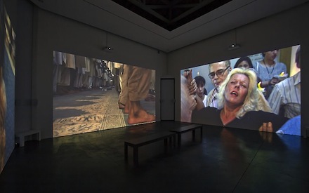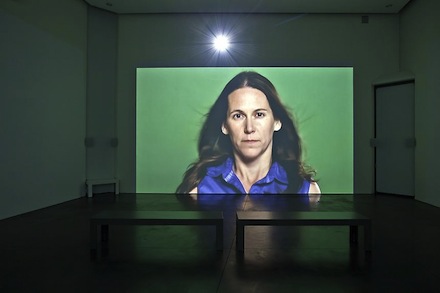 The East Gallery features, The Globe Shrinks (2010), a 13 minute multi-channel video installation. Using the four gallery walls for projections, the video cleverly creates relationships between the four walls and the action within the videos. On one wall, a women stands against a green background with her hair billowing in the wind. Directly opposite, a vintage fan appears to provide the wind fanning her hair. People tell lightbulb jokes. Muslims, Jews, and Evangelical Christians engage in religious rituals, each on their separate wall. Occasionally the room goes dark and a voice addresses the viewer, making comments like, “You’re thinking about everything you want and don’t have. I’ve got you where I want you. In the dark.” Occasionally, the images coincide with similar messages in the signature white on black text.