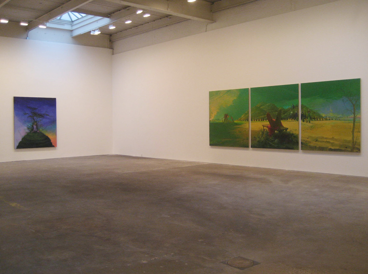 Triptych, a standout of this new collection, explores these concepts in a series of three canvases in an otherworldly, counter-intuitive order of sorts. Babushka-wearing Russian peasants are paired with a female nude, legs spread apart, against the backdrop of a rustic, dreamlike mountainous terrain. The lazy, voyeuristic stance recalls Marcel Duchamp‘s Etant donnĂ©s. Exploring conflicting themes of liberation and restraint, illusion and reality, and transience and longevity, Yuskavage creates a world all her own full of twisted figures and artifices.