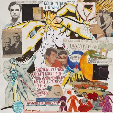 In his current solo exhibition at Regen Projects, Desire in Pursuyt of the Whole, Los Angeles-based artist Raymond Pettibon shows a range of his works, from the more recent densely-woven collages to his well-known heroic surfers. Pettibon is one of the few artists whose work moves fluidly between the pages of Juxtapoz magazine and the walls of the Whitney Biennial, sustaining both the criticality of a conceptually-oriented practice and the cool ease of a graphic novelist.