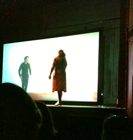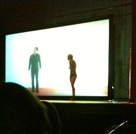 The second section, Women, brought a series of female performers to the stage (who, come to find out, answered a casting call on Craigslist in order to be a part of the performance) as one of the central scenes from The Glass Menagerie played on a large video screen in the background. Franco acted as the character of Jim, and each rotating female figure, entering and exiting at Nakadate’s direction, assumed the role of Laura as her lines flashed upon the screen. Sometimes unassuming, sometimes melodramatic, each female that entered the stage in the midst of this hyper-controlled theatre-karaoke, was unaware of her impromptu role in the performance (one woman even placed a candid cell phone call to her mother). Seated stage right for the entirety of the scene, Franco and Nakadate acted as directors for the inconspicuous performers. “Speak up,” “Face the audience,” and “Read your lines!” were among the exclamations they delivered as the various female performers struggled through the scenario—expected to respond, dance with, and even kiss the male lead through the video screen veil. As the scene concluded, Jim’s words seemed more apropos than ever: “Everyone excels at something… some people just excel at more things than others.”