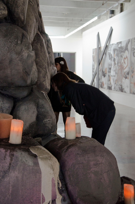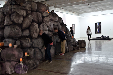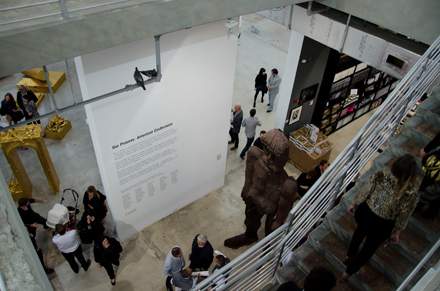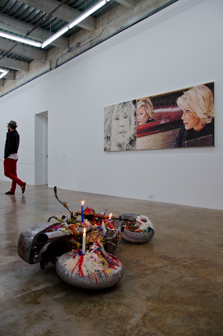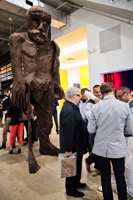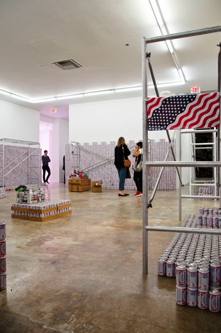 Art Observed was on site for the private Tuesday evening preview of the Rubell Family Collection/Contemporary Arts Foundation show American Exuberance. Throughout 28 gallery spaces in a 45,000 sq ft museum, 190 works by 64 artists explore the American condition today through art, dissecting the paradoxical arenas of culture, economics, and politics. A 244-page catalog includes written commentaries by 13 of the artists from the notable roster, as follows: Thomas Houseago, Richard Jackson, Rashid Johnson, Nate Lowman, Richard Prince, Sterling Ruby, Haim Steinbach, Ryan Trecartin, and to name a few. About a quarter of the works were made in 2011 specifically for the show. Also, Art Observed returned the next morning on Wednesday for Jennifer Rubell’s 11th annual breakfast, which is presented every morning throughout the week, treats visitors to a small jar of fresh yogurt, to be ‘anointed’ with honey dripping from the ceiling.