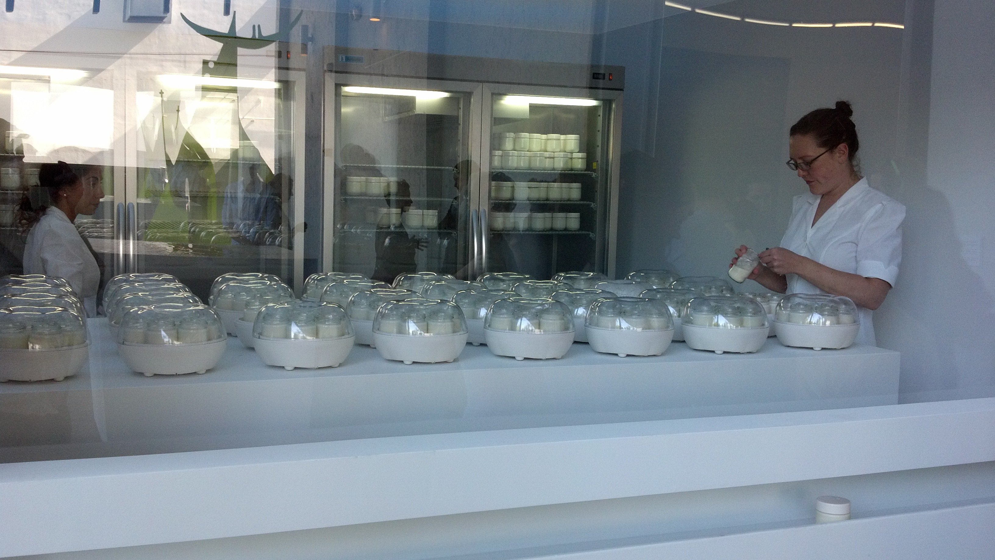 Collecting dripping honey at Jennifer Rubell’s Incubation yogurt and honey breakfast.
