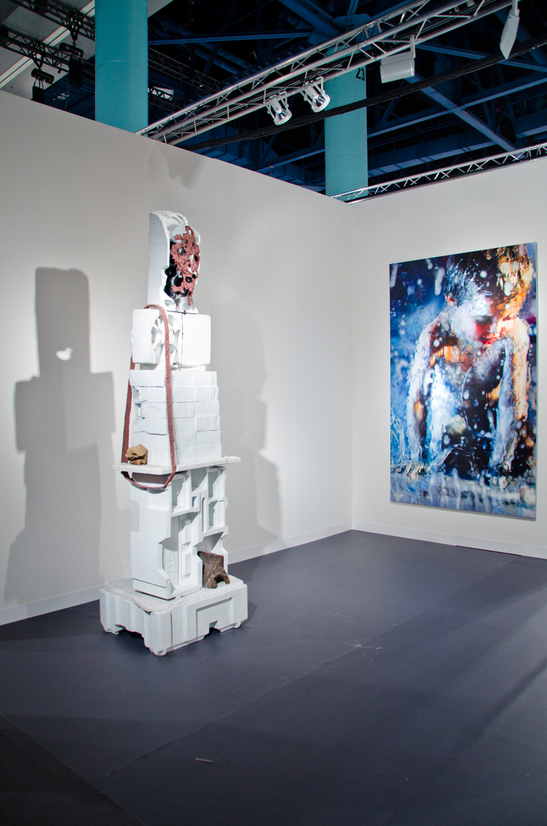 Huma Bhabha, Ghost of Humankindness (2011), left. Marilyn Minter, Lil’Mercury (2011), right. Salon 94.