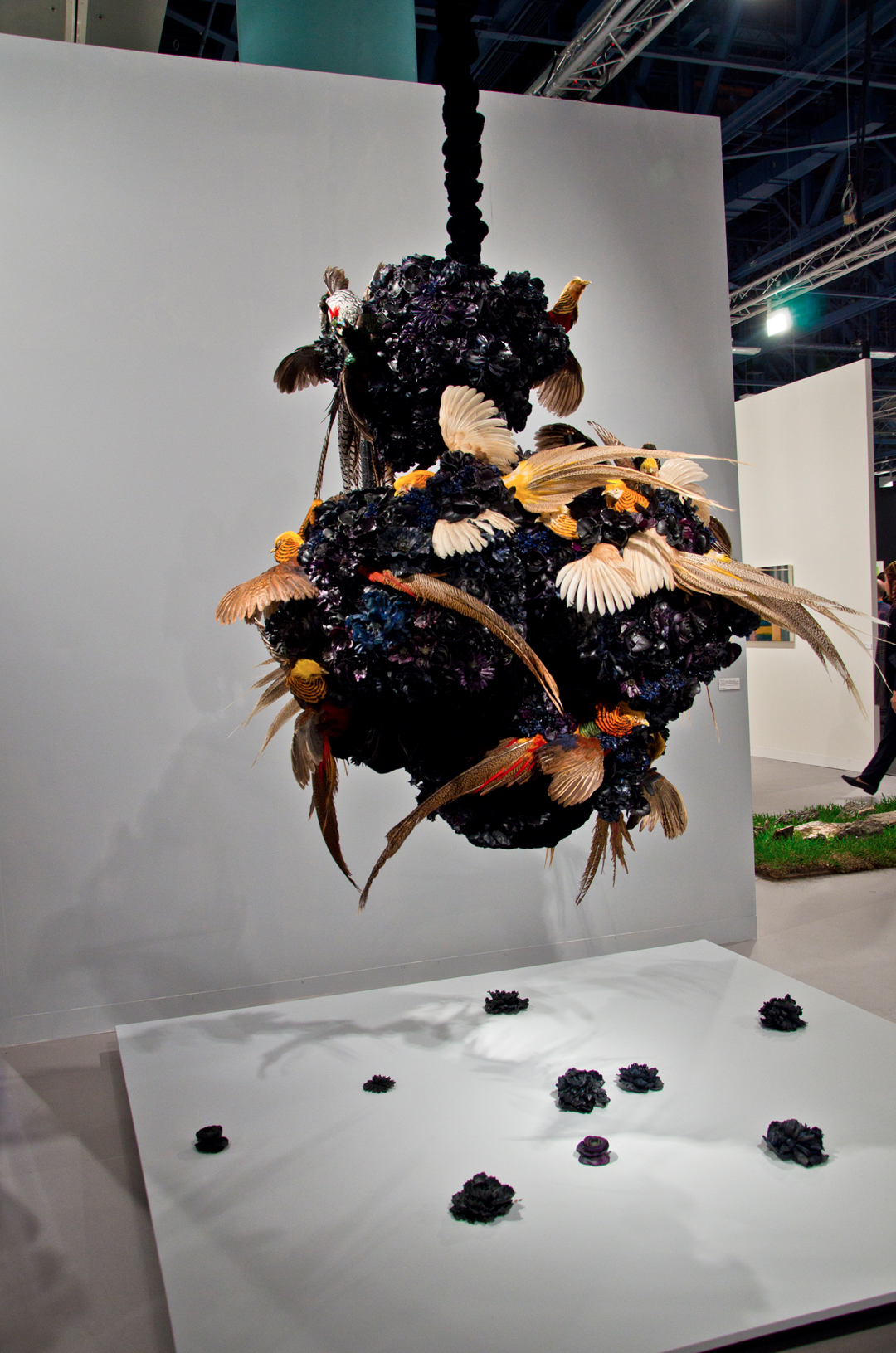Galleries of course not only hope to sell works at the fair, but build relationships with new and old clients, as well as promote new art. Team Gallery highlighted new works by Ryan McGinley, hoping to catch the eye of those who already buy his work. Anton Kern was excited to showcase the new direction in painting of artist Ellen Birkenblad, while nostalgic cast resin shoes hung over head by Richard Hughes.