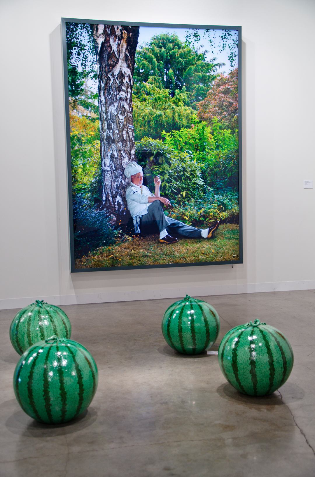 Rodney Graham, Betula Pendula ‘Fastigiata’ (Sous-Chef on Smoke-Break) (2011), back; Ai Weiwei, Watermelon (2006). Lisson Gallery.
