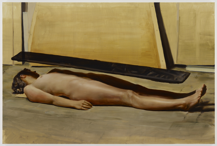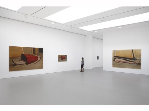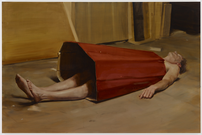 Borremans’ paintings are united by their ambiguous, empty backgrounds containing a single subject. Each figure seems to be simultaneously contemplative and unconscious. The exhibition’s title comes from his 2011 painting The Devil’s Dress in which a figure lies face up on the ground of another warehouse-like space, wearing a stiff red cardboard dress. Despite the rich yellow-brown tones of the background and the warmth of the red, the entire space feels cool. Borremans’ paintings are haunted by peculiar figures with unreadable faces and emotions, warmly framed while remaining mysterious and distant.