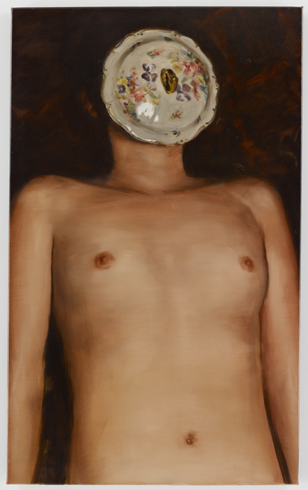 The Loan, like The Knives, illustrates a similar disconnect between the subject of the painting and its title. The subject of the painting is a headless female mannequin whose limbs look entirely real. The skin folds at her elbows and the back dimples make this into a real body, yet instead of a head, the neck is topped with a metal collar. As in a store, the mannequin stands on a small square of floor, the setting too vague to identify.