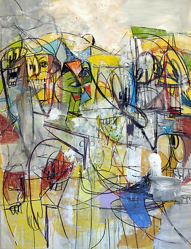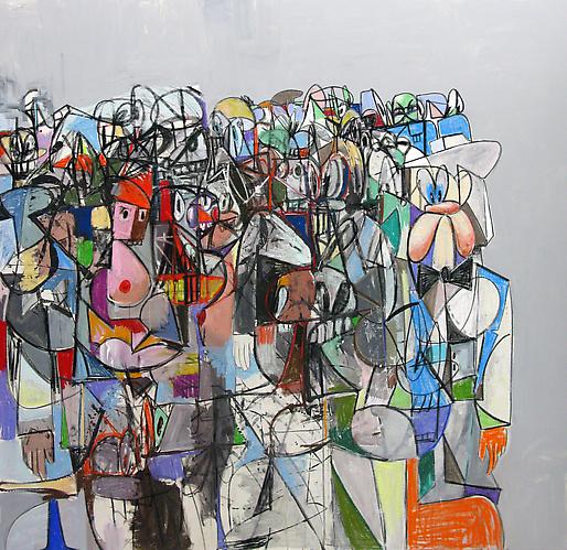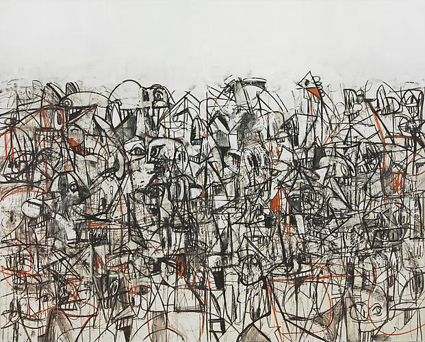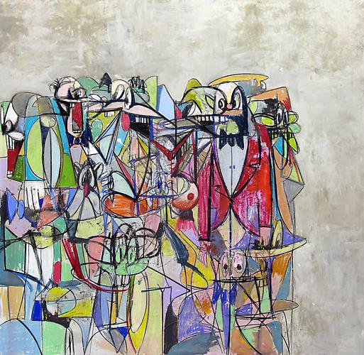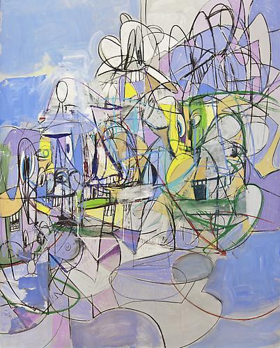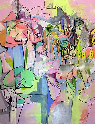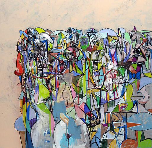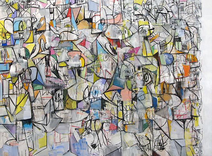 George Condo is currently showing eleven new works from his ongoing series Drawing Paintings at the Skarstedt Gallery in New York. Combining techniques of spontaneous drawing and more calculated painting, the series blends charcoal lines with pastel acrylics in Condo’s signature figurations. The large colorful canvases are busy with eyes and teeth, bowties and breasts, with the series-within-a-series, Compressions, leaving small stretches of blank canvas outside the compressed scenes. Condo says of the series, “They are about freedom of line and color and blur the distinction between drawing and painting. They are about beauty and horror walking hand in hand. They are about improvisation on the human figure and it’s consciousness.”