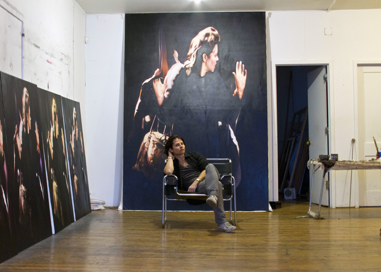 NH: Why painting? In my past, I always used to do paintings but I didn’t consider myself a painter. I saw myself as an image maker or a storyteller. I’m interested in paintings and their effects on people, but I don’t consider them as a painter. Before the Geniuses I had a big show at the Tel Aviv Museum, and they were big paintings that looked like advertising from the 70’s and they were very realistic. People always ask me how I make them, it’s like magic. I mean when people see realistic paintings like Gerhard Richter or John Currin they don’t even look at the painting, they only think about how the artist created it. I’ve always believed that good art is magic. It goes beyond theory, it lets it go. Good work can be seen in any context, even if you changed the title or if in one show it was said to be about light or real versus abstract in another, it’s all politics. When I was working on the Geniuses I started to think about painting from a completely different place. There was something about brushstrokes, and underpainting, so many things that seemed cliché and not really relevant, but when you look at the Frick or the Metropolitan, Chelsea seems so weak. Those old paintings have such charisma and such energy that you just cannot capture in a photograph. No matter what, a photo is not interesting in that way. I think it’s important for them to be paintings, no matter what technique I used to change them. And as for the repetition, I thought a lot about the shadow paintings by Warhol. They were a big influence on me. After I did the first piece, I shot it and brought it into Photoshop and it just reminded me of the shadow paintings. I started to think about Warhol after somebody said to me that ‘it’s so beautiful to discover her after all these years, that she was in the shadows’—and that’s where it started. Originally I was going to do four, because I liked that aesthetically and because it’s much easier to build a narrative with three or more paintings. The original four were about showing her in different colors, it was about mood. There was this documentary on the history channel that showed footage from World War Two in color for the first time, and the green and blue and brown in the paintings was from my first memory of seeing that documentary. Then came the purple and blue, and then the red. It puts it in sort of a twilight zone.