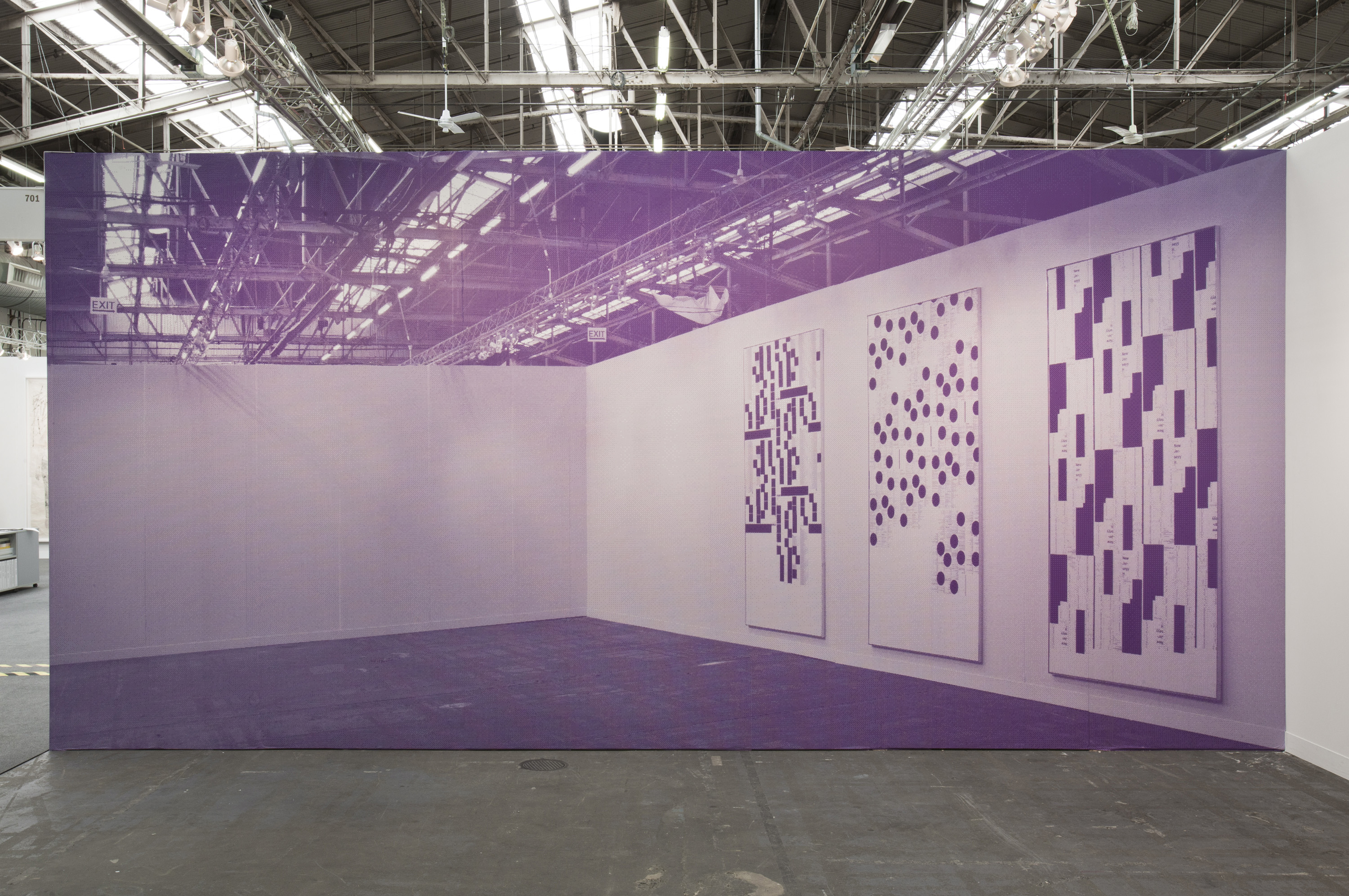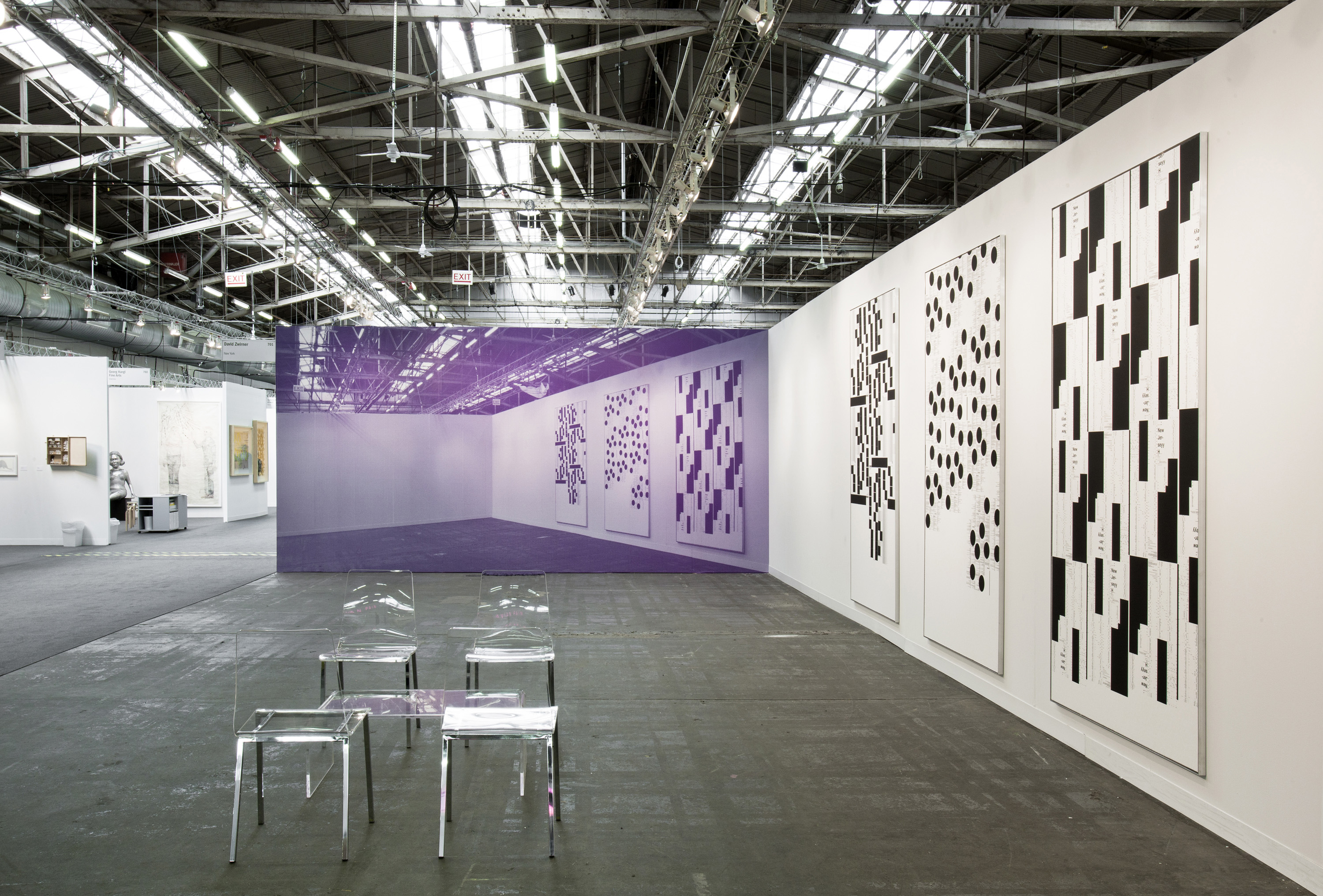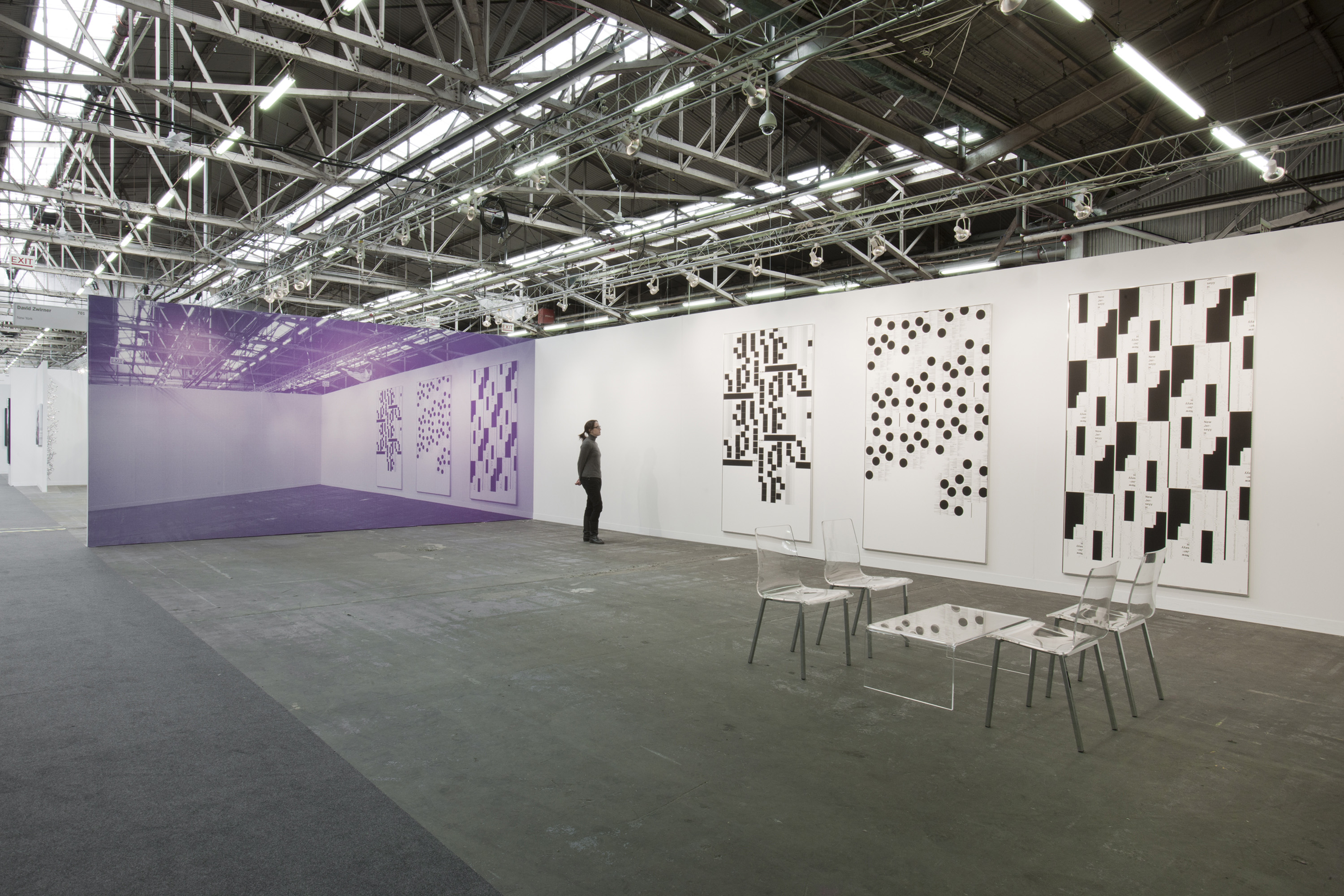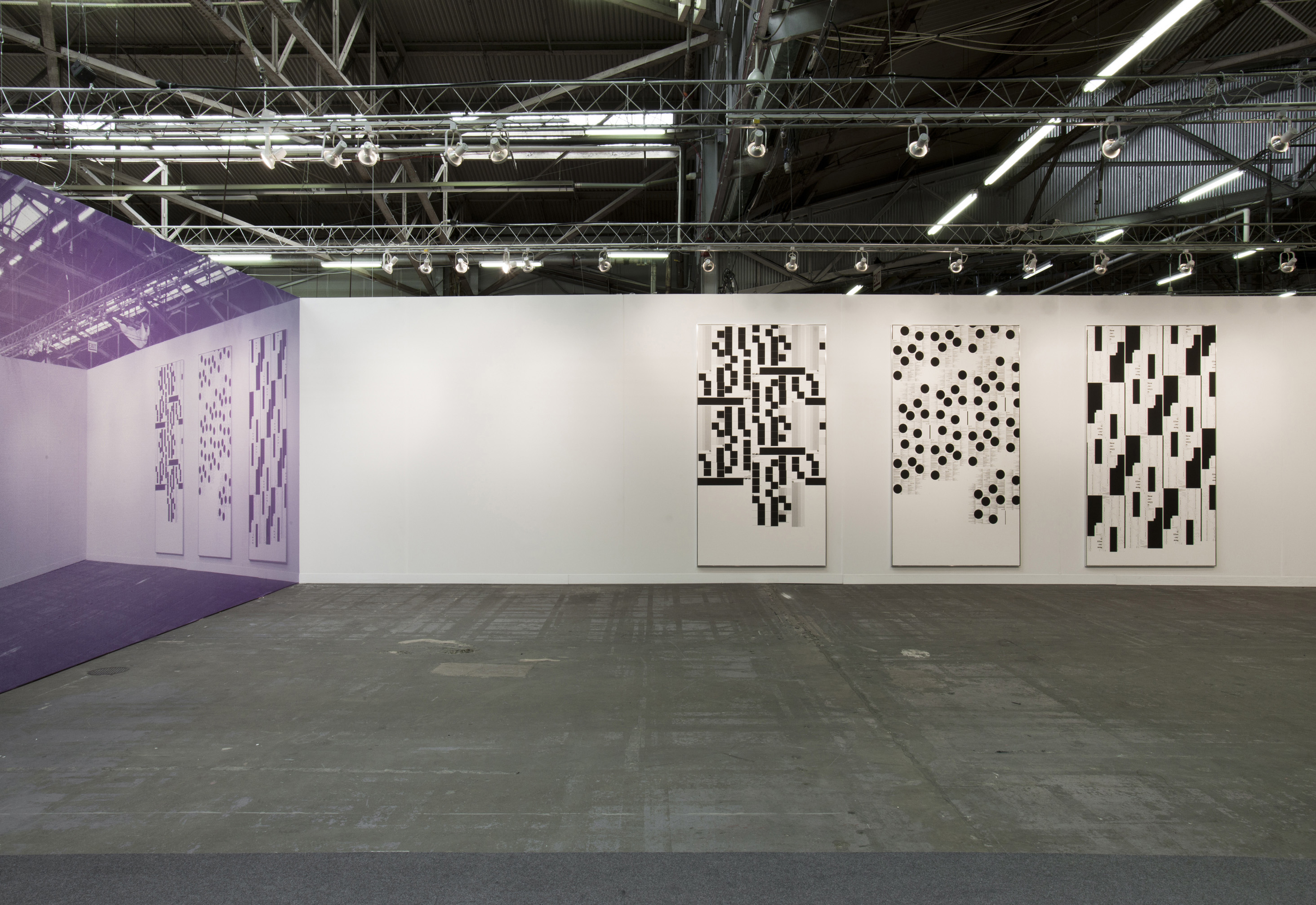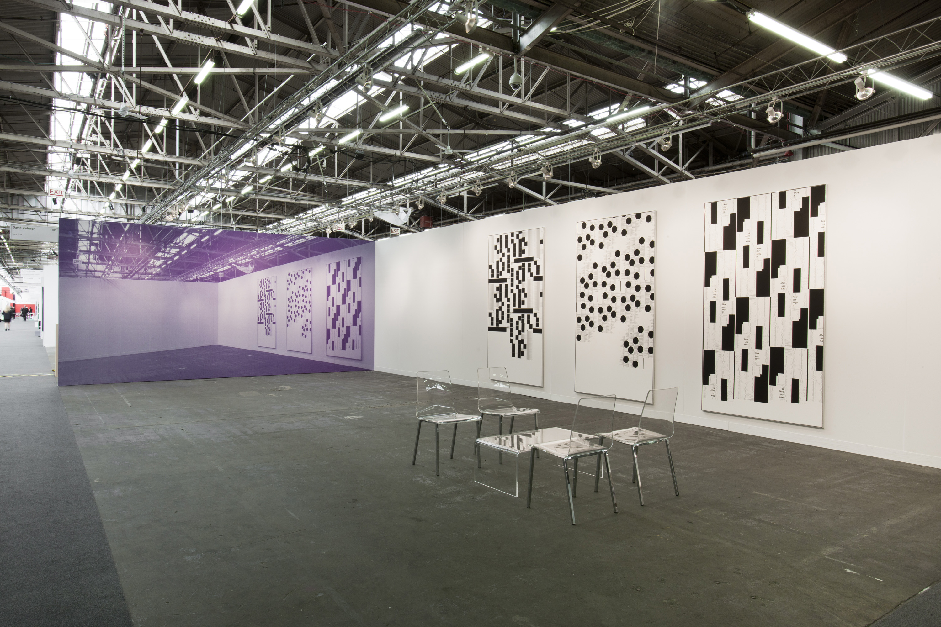 MR: Yes, to have this moment—when you are producing something, at the same time you are hiding something. The concrete, are the things which are not produced. It’s a kind of definition of form—when you are defining a circle you are making an inside, but you are also making an outside. Showing something that is empty and at the same time, not empty. It’s a good example with the wallpaper over there, [pointing to his wall-size photo of the Zwirner booth] and a lot of people don’t recognize what is a really great paradox that I’m showing something on a wall which is empty in the image. It shows emptiness within the documentation, which is a character of documentation, there is always something missing. Or something lost in the transport.