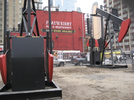 Situated within the western reaches of Times Square, between an advertisement for Jesus Christ Superstar, a multistory parking lot, and the Playwright Pub, stands New York-based artist Josephine Meckseper’s Manhattan Oil Project. The work, supported by the Art Production Fund and Sotheby’s, is the second installation in The Last Lot project space, an initiative sponsored by The Shubert Organization for the Times Square Alliance’s public art program. Occupying one of the few remaining vacant lots in this seat of American commercial culture since Monday, the two hulking red and black structures rhythmically swing up and down, reaching 25 feet at their highest points. Meckseper explains, “The critical placement of the pumps is a conceptual gesture that raises questions about business and capital; land use and resources; wealth and decay; decadence and dependence.”