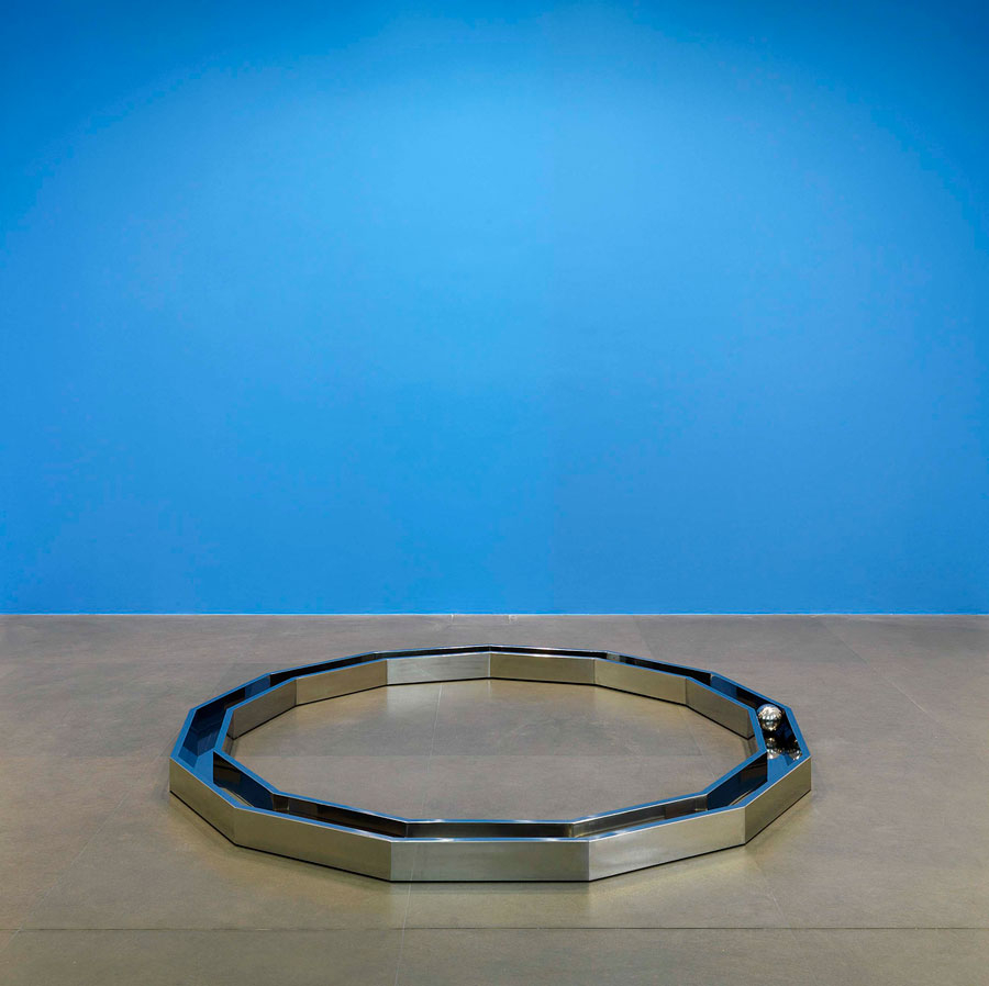 There are also two stainless steel floor sculptures: Large Rod Series: Circle/Rectangle 11 (1986) and 13-Sided Open Polygon; again, both are multi-sided. The former work is displayed in a rectangular pattern, but could also also be displayed in a circular pattern—hence the title. The polygonal piece comes from a series of floor sculptures whose form ranges from five to seventeen sides, and were made by De Maria between 1973 and 1984. These pieces could be positioned in different shapes, showing the freedom of architectural sculpture. De Maria’s art emphasizes the combination of order, such as geometrical patterns, with randomness, such as the ability of a piece to be positioned in numerous ways.