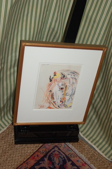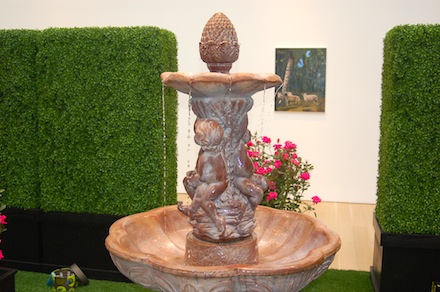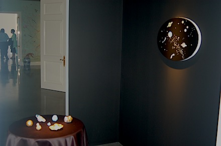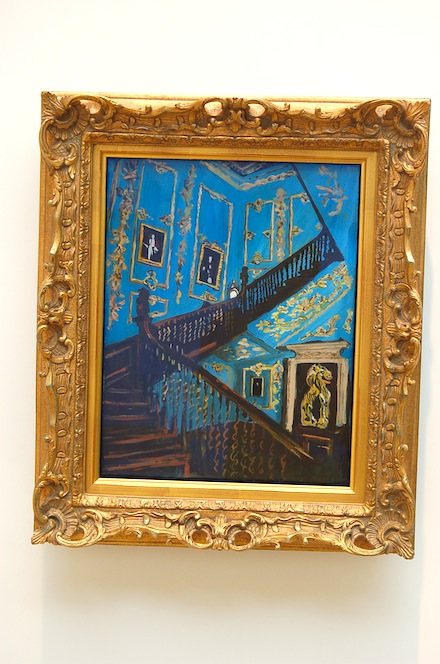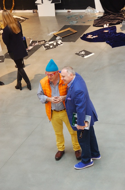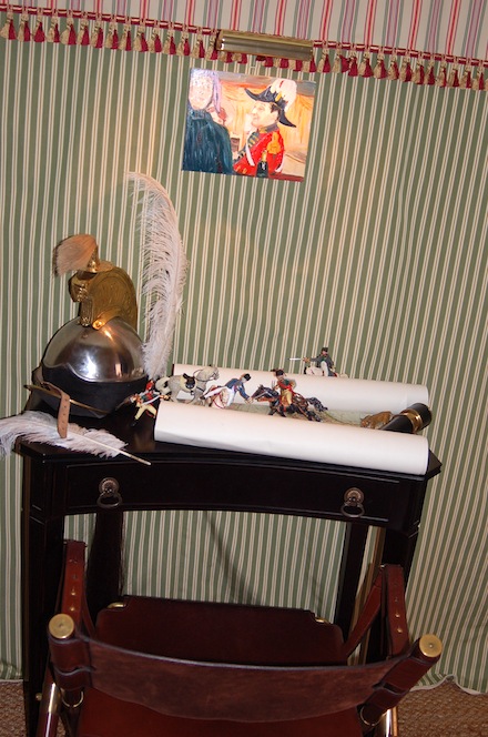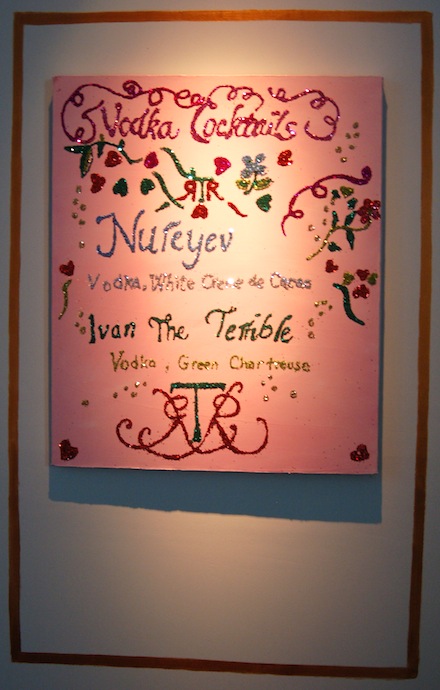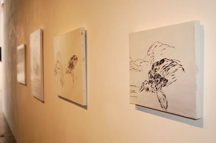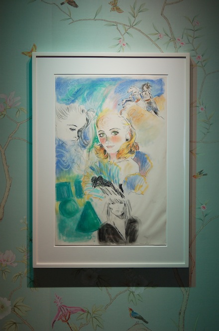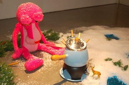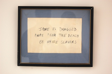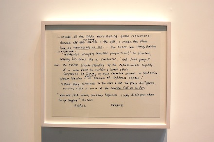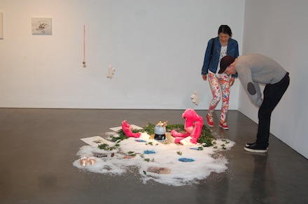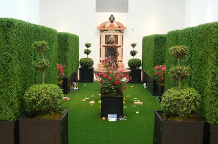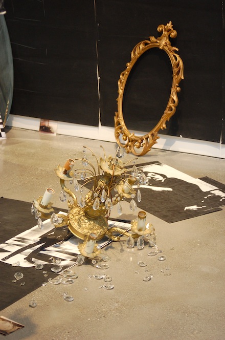 Inside the converted stone barn, a two story universe was unfolded by Kilimnick. Working in a variety of mediums, the first room features early work; drawings of fashionable looking women with bits of text scratched into the margins (dates and times, cities, clothing labels) that are at turns playful and lonely. Further into the exhibit newer, site-specific commissioned pieces and installations took residence: a shopping bag and perfume strewn miniature Versailles; a war-time tent rendered innocent by its slightly insufficient size and toy-like contents; two altars dedicated to Baroque-era symbolism and an alternate “altar” where art and photographic culture had come crashing down in a pile of broken chandeliers, empty frames and xeroxes. Kilimnick’s show at the Brant Foundation is a head space all its own.