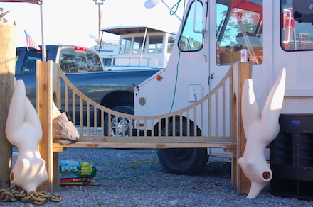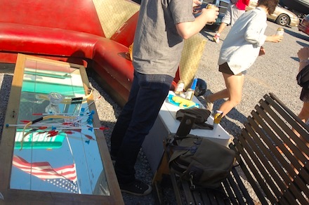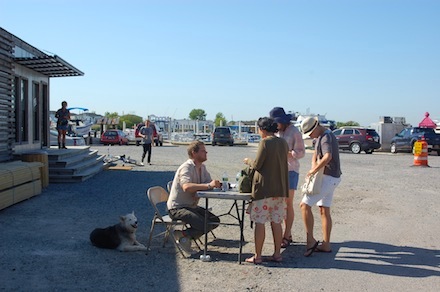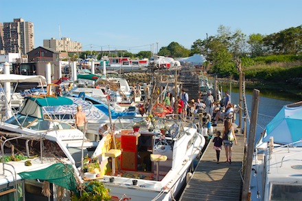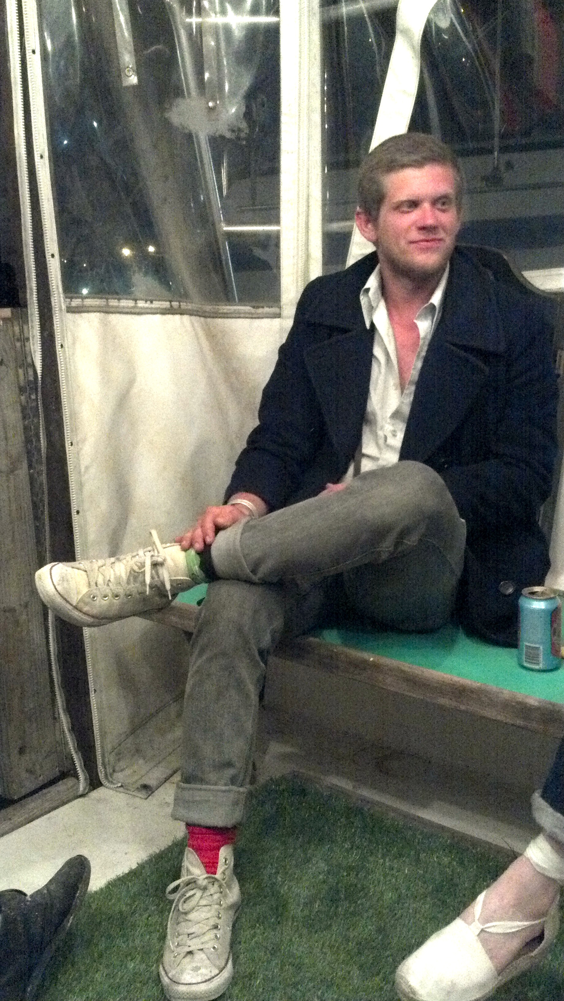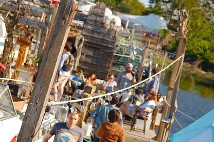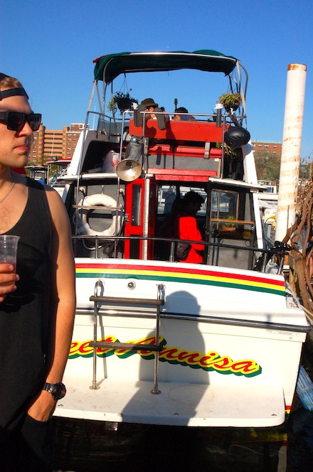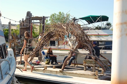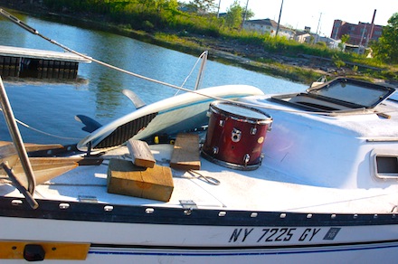 Planes from nearby JFK fly constantly overhead, providing both grounding and surreal background noise. The opening night held a brief sound performance, as one boat had prepared for with washboard surfaces and several places to bang with sticks and hammers. The day crowd waned to only those staying for the night—a mix of young creatives and older local fisherman staying on their own boats nearby—most with a beer or flask in hand, and all enjoying the out-of-doors, floating DIY camaraderie.