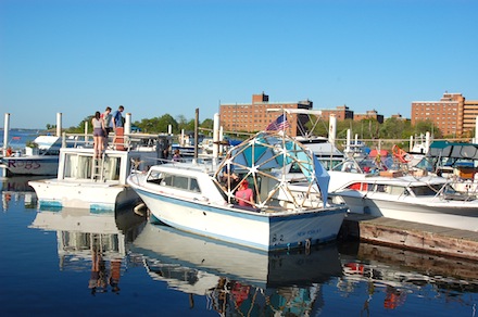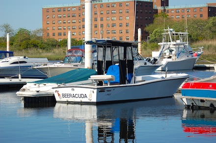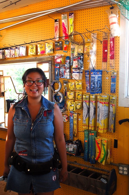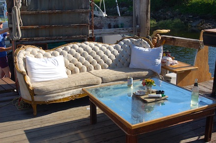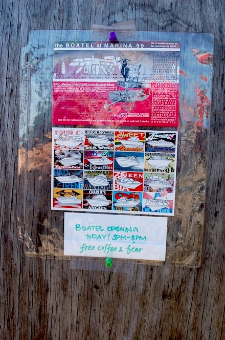 Arriving at the Beach 60th Street A Train stop, Marina 59 is two blocks away; the beach is three in the other direction. At the end of a gravel parking lot/boatyard, a boat on land holds the Boatel office, with a food truck, DJs, and an open bar on the opening Saturday. With fishing lures and other bait for sale inside, a spray-painted sign out front directs guests down to the docks. Before the boats sits a lone chair out on the end of a dock, setting the tone for relaxation—and a good photo opportunity (below).