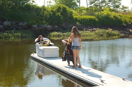 The boats are grouped to the left side of the main dock with improvised floating platforms between to provide extra community party space. A grill and a couch are on the biggest deck, with a single chair-raft on a pulley system to a deck on shore. The deck on shore supports a frame for a video screen where various screenings are shown, while the chair also simply acts as an accessory to adventure.
