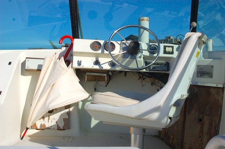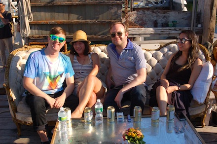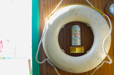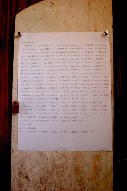 This writer spent the night in The Country Club, a classy, astroturf-lined, ‘Live Large’ vessel fit for the yacht club, styled by Jordan Johnson—after a ‘half quart’ can of Country Club Malt Liquor. A small room, The Study, hosts “a place to read, write, draw or not read, not write, and not draw,” as stated on a typewritten note to guests advising party and safety procedures. From a cozy hull bed in The Nest, a hatch opens above to the front deck with a lifeguard’s stilted sunning chair, while the back of the boat is more sociable, featuring ‘The Veranda’ and several seats. Johnson suggests “listen[ing] to country music in the daytime, and motown at night.”