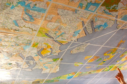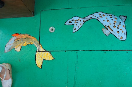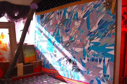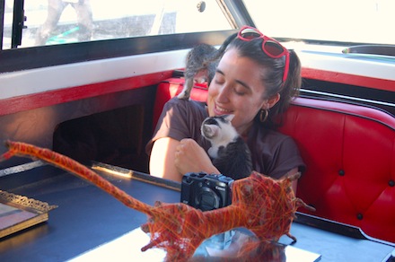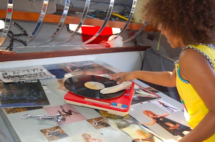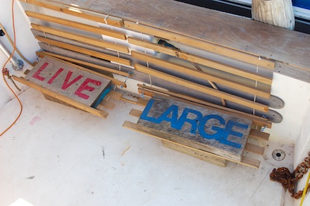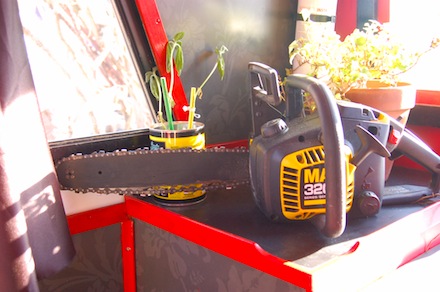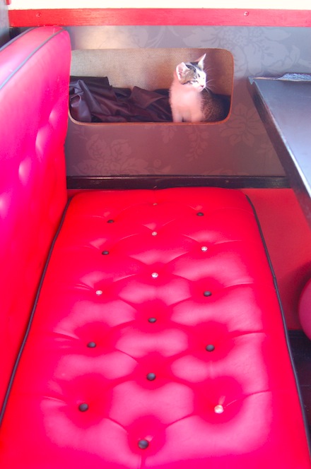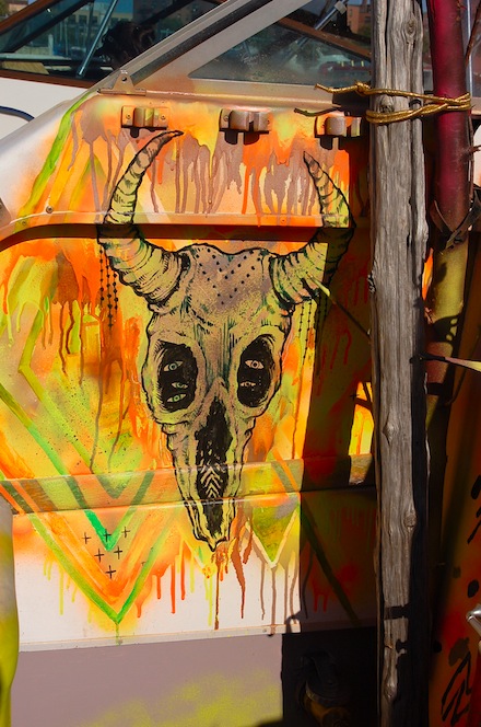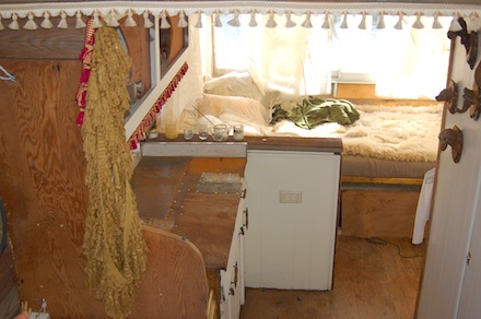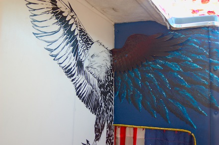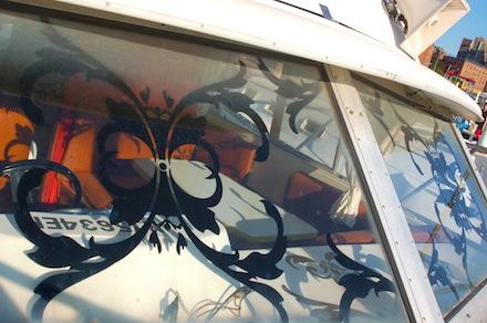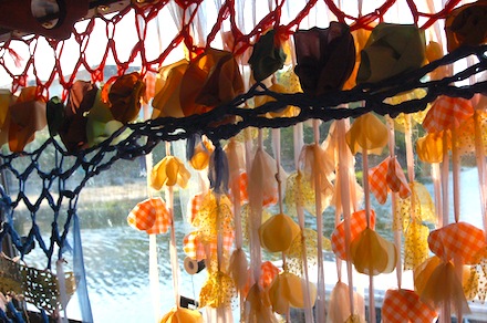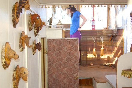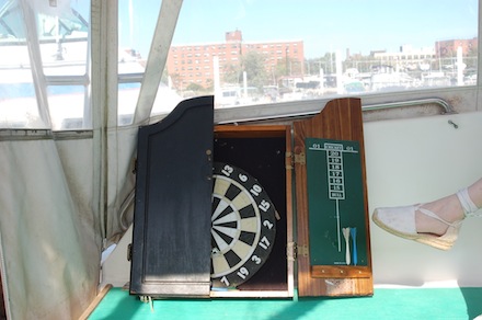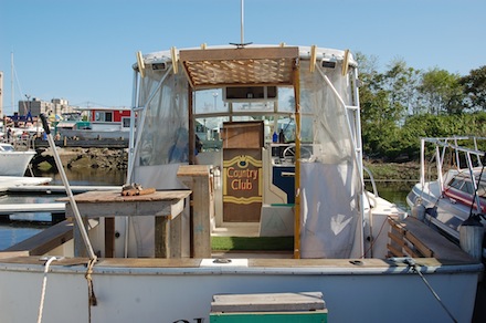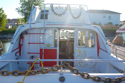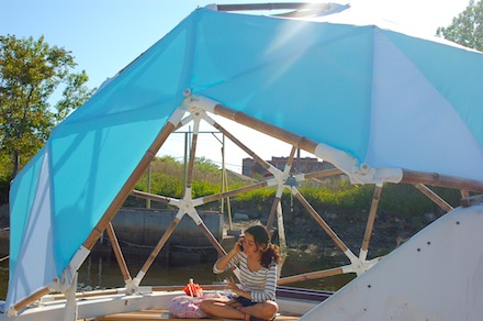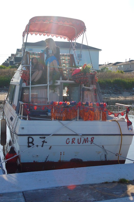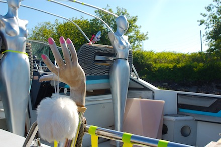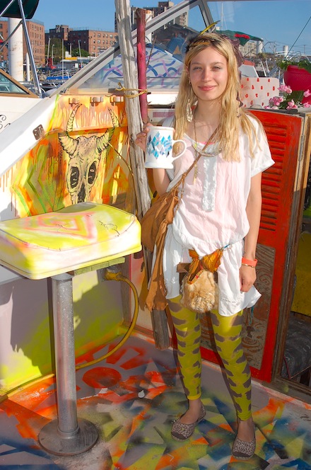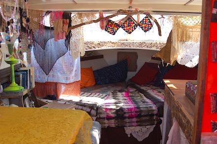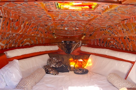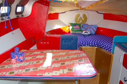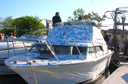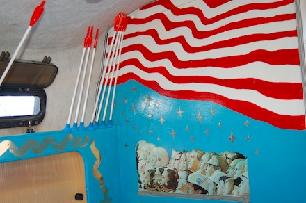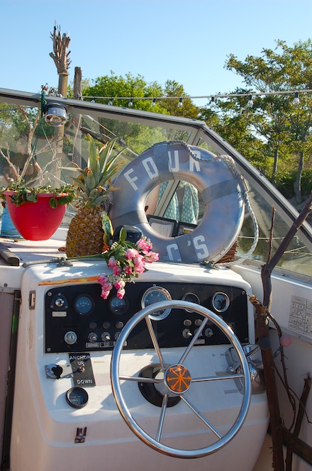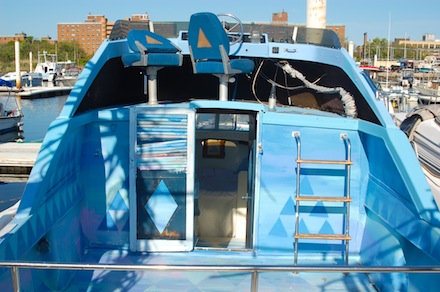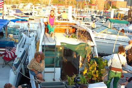 The 30 footers—give or take a few feet—are generally adorned with a certain level of campiness. An American-saturated boat features flag lights, stars-and-stripes bedding, and a large painted eagle. Two takes on the future include Alana Fitzgerald’s post-apocalyptic neon and digital art—with a pineapple next to the steering wheel—while another boat presents a more space-age future, with silver mannequins and a Fischer Price record player. The Ms. Nancy Boggs boat boasts multiple sunning decks and a “Victorian-era naturalist’s laboratory,” including a drawer full of pseudo artifacts. Another boat is home to several small kittens as well as a chainsaw, and another boat departed to a more minimalist style with a geodesic dome constructed of bamboo and PVC. Most boats claim an occupancy rating of 2–4 persons, depending on guests’ level of intimacy/partying.