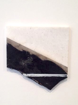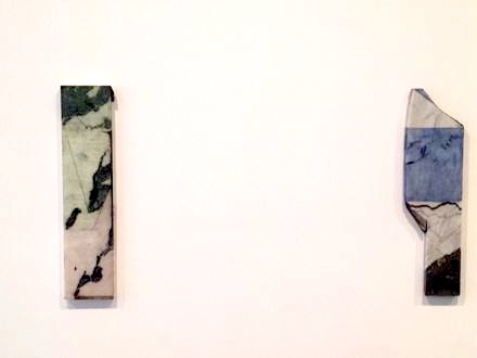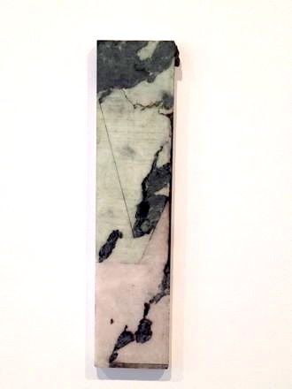 Fifteen oil on marble paintings comprise the section of the show held at the 526 location. Marden produced this body of work in 2011 while staying on Hydra, an island off the coast of Greece. Each slab of marble has a unique black and white granular pattern. While the strokes are primarily heavy, in certain pieces the paint is incorporated into the marble almost indiscernibly. The addition of oil and graphite to the stone in Joined is hard to distinguish from the naturally occurring mineral striations. Conversely, Formal Marble, infused with blocks of primary colors, appears to be a more simple color field painting. These paintings stand in conversation with the artist’s earlier body of marble paintings made over a six-year period beginning in 1981.