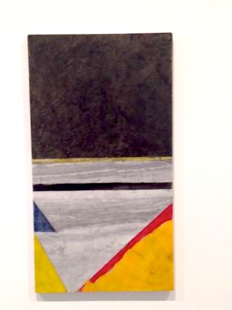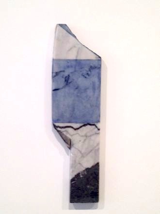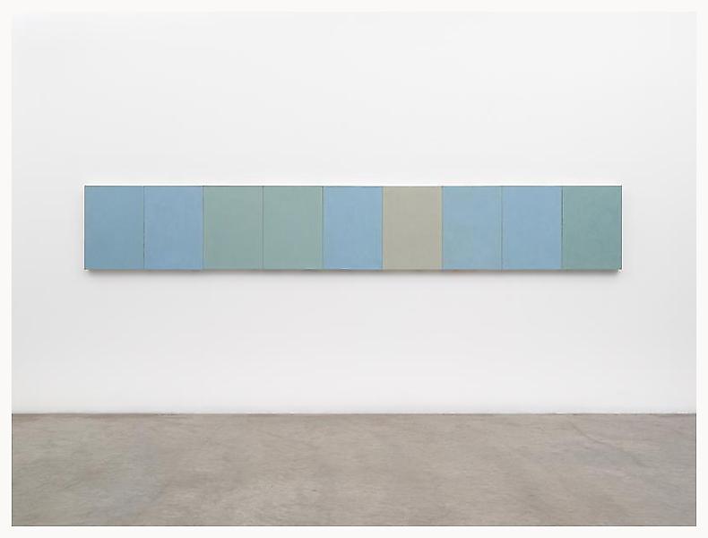 Ru Ware Project consists of a nine-panel painting inspired by Marden’s interest in Chinese art and pottery. The piece was started in 2007, following a trip to Taipei where he saw an exhibition of the ancient Chinese imperial ceramics known as Ru Ware. Ru Ware is regarded as one of the premier artistic achievements of Ancient China, with fewer than 80 of these antiquities currently intact. Ru Ware Project has a minimalist aesthetic with its series of monochromatic panels attached to each other in a horizontal line. Each section represents a color typically used in the glazing of these 11th century ceramics; a specific range of delicate earthy blues and greens that Marden recalled and reproduced over a five-year period from memory. In the same room behind a glass case is a piece of an authentic Ru Ware pot from the Song Dynasty, which sets a visual precedent for the painting.