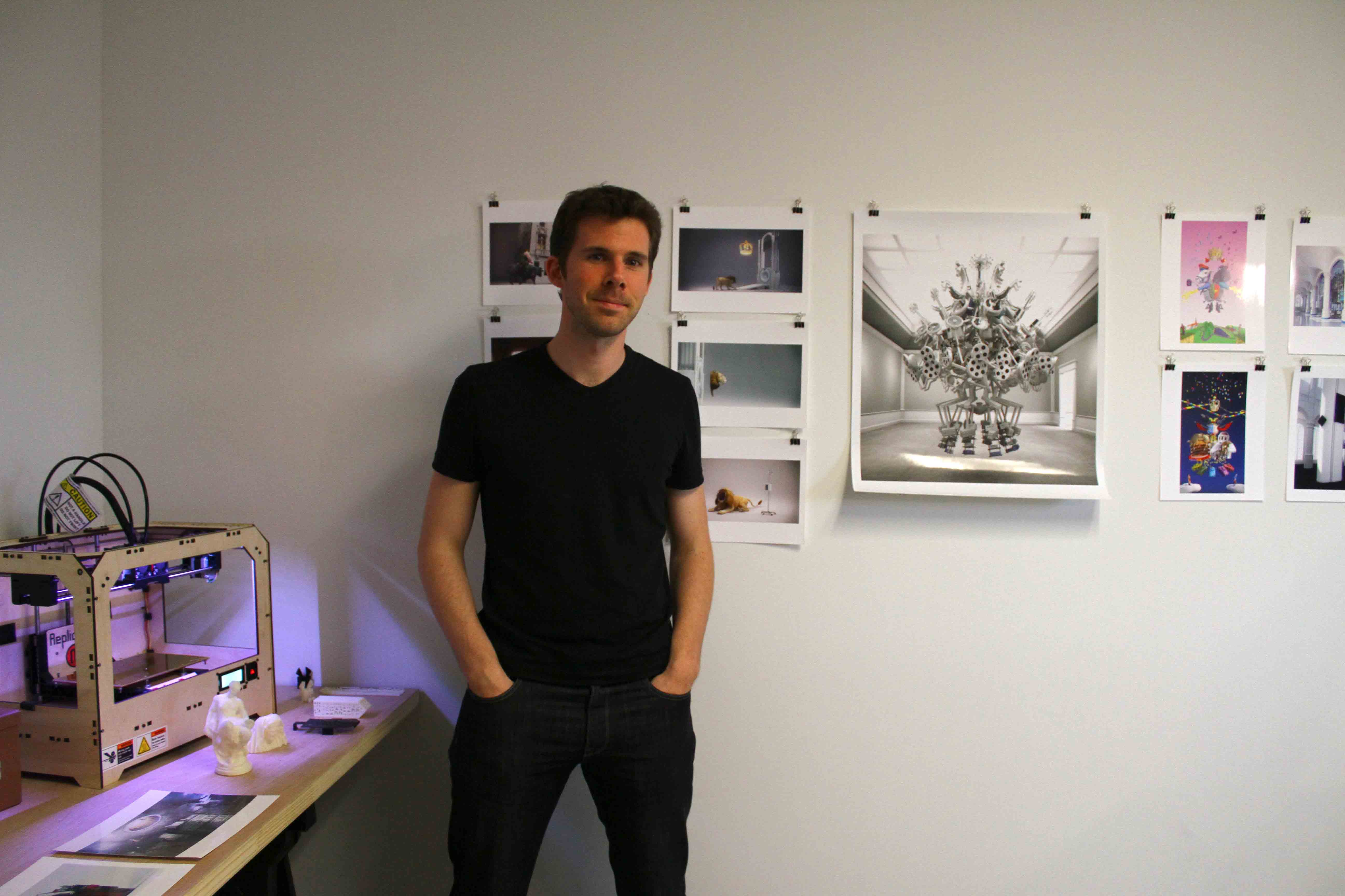 Jonathan Monaghan with his work and MakerBot station