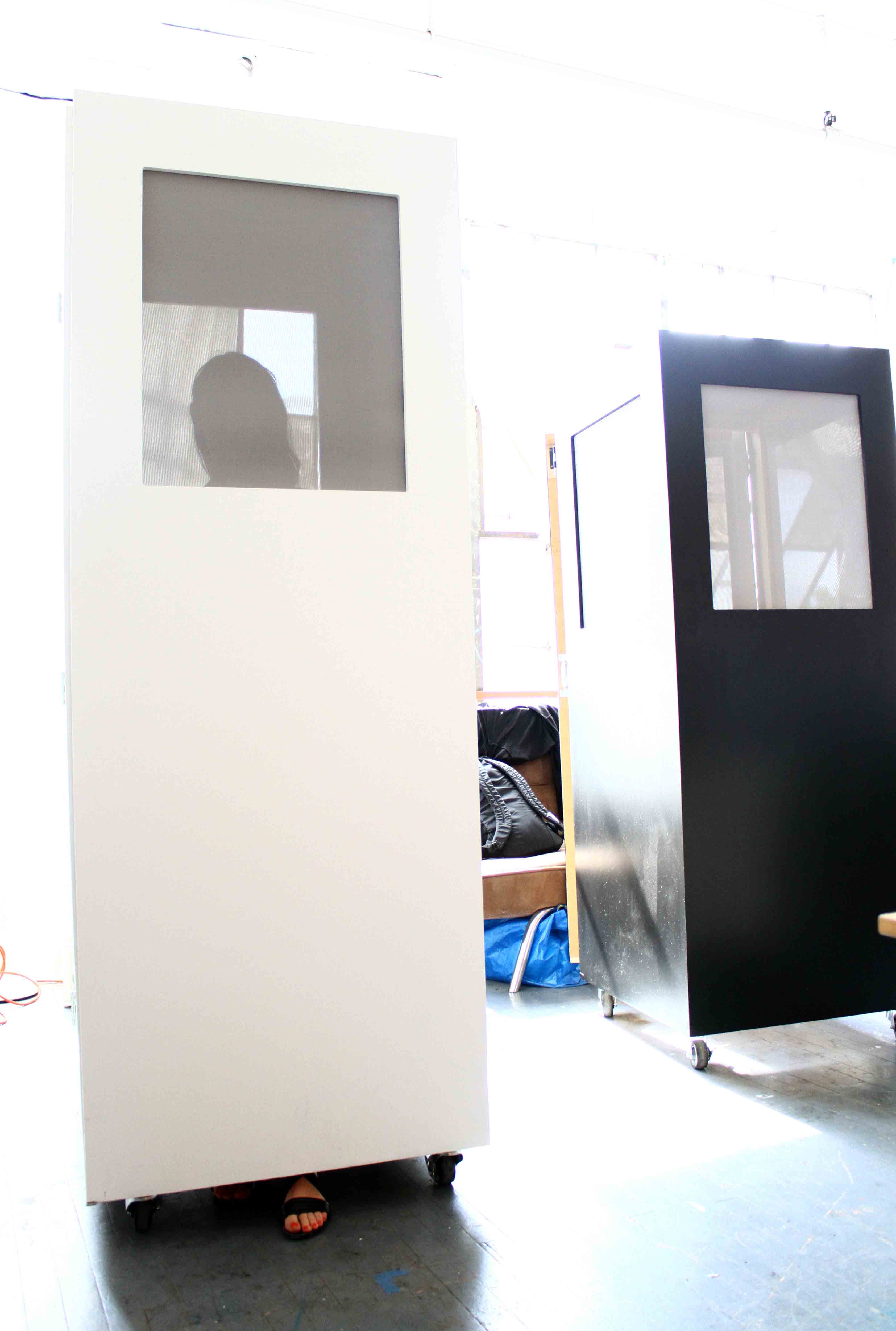 Oliver Warden’s “Untitled Box 2.0″ installation resembles a plain mirror at first, but reveals a live man inside (the artist) as soon as viewers flick on the box’s light switch. Photos for Art Observed by Elene Damenia and Lisa Marsova