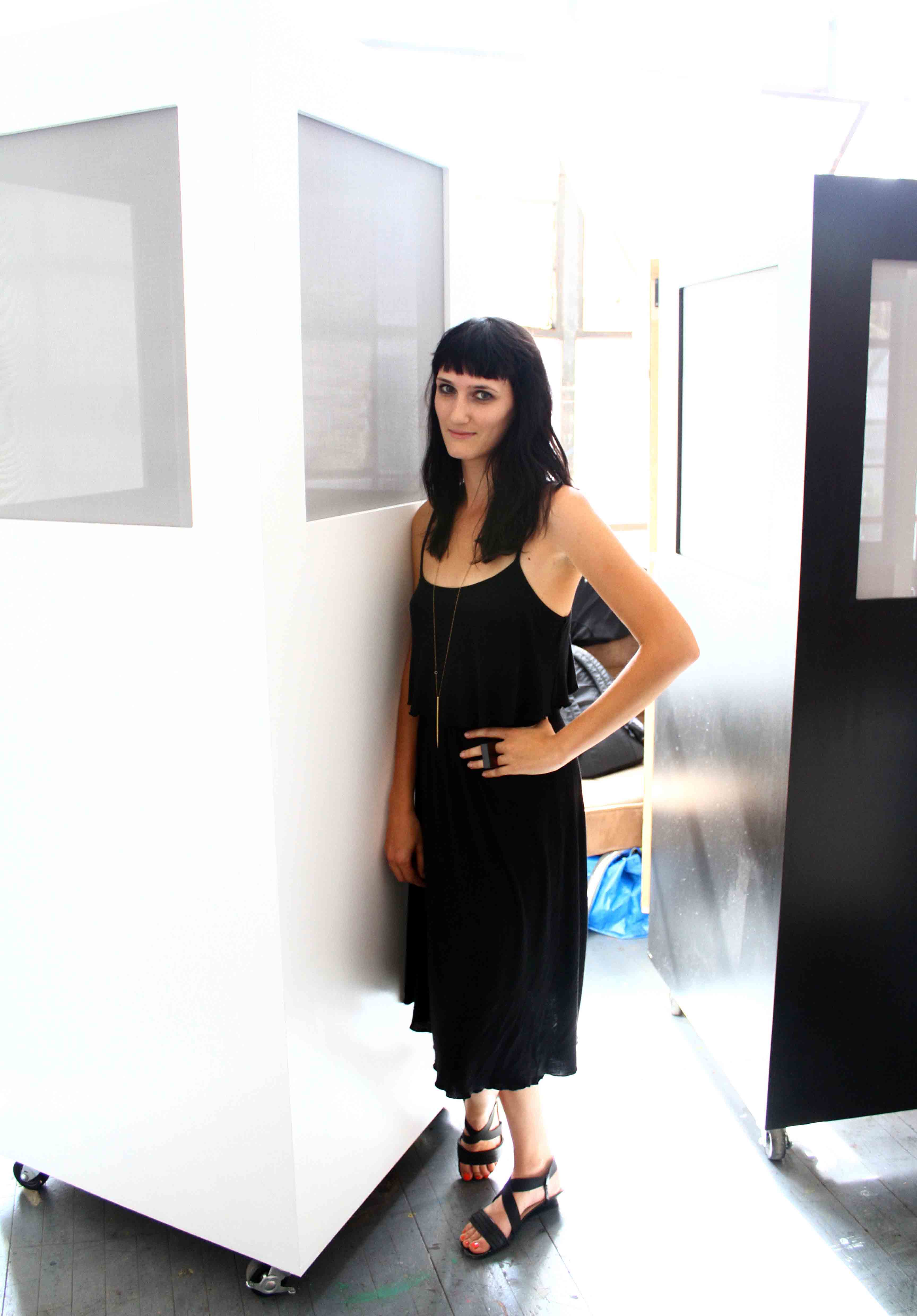 Arielle Falk posing with her latest work “DE-INHIBITIONATORS”, part of a performance piece that showed in Union Square on April 21