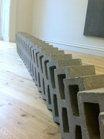 Here Comes is an exercise in subversion, the space’s luxurious façade home to a microcosm of intense color and scattershot innovation. The exhibition is staged in a Greenwich Village brownstone, surrounded by private residences that have suddenly found an art gallery in their midst. The works themselves are alternately sculptural (a teetering folding chair balances above the heads of gallery-goers, 20 cinder blocks lean against one another on the floor) and abstract swaths of color, impressionist smears highlighted by Da Corte’s dreamy triptych “Loveless” and Louis Eisner’s “Yellow Right Turn.”