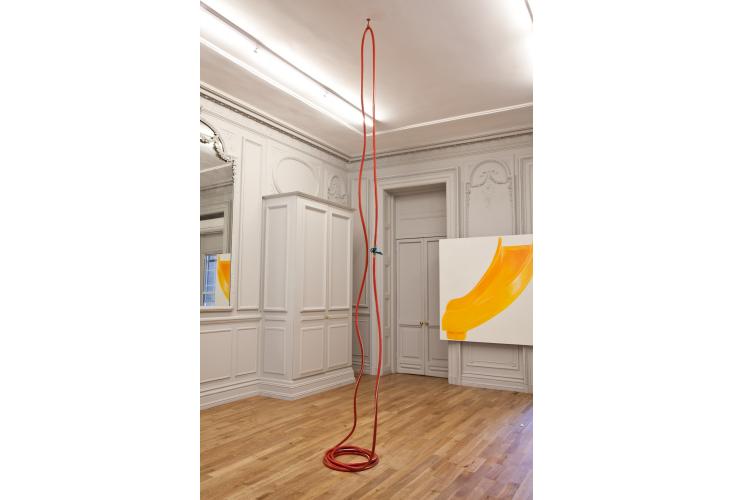They are spattered about Fletcher’s space with an eye towards the inaccessible, hiding canvases between nooks and crannies and disrupting the natural walkways of the space. The processes behind Still House’s pieces operate in much the same way: what passes for paint at a glance may actually be shampoo (Da Corte’s “Loveless”), the consumerist material repurposed for its viscous and ever-changing texture. Eisner described the underlying theme of the show as an exercise in “movement and singular gestures that have been refined over the last couple years that we’ve been working together…iconic, gestural pieces that posit objects as sculptures frozen in space.” These sentiments are further echoed between pieces like Alex Perweiler’s “Chameleon,” created using the chemical elements of the darkroom—save for that last step, to be fixed—and Zachary Susskind’s “Peripheral Influence”, a rubber hose hanging from a hook that might take any shape. This approach allows the work to float, shift and adapt—to be something undetermined—a breathing space not often afforded so appropriately.