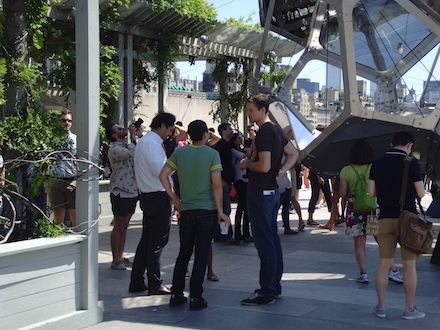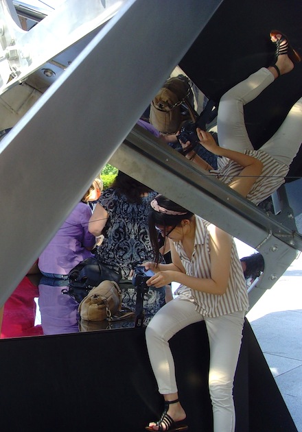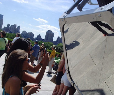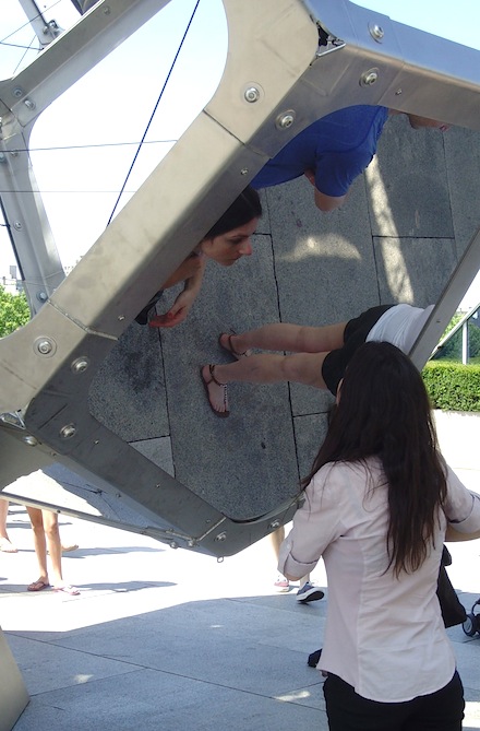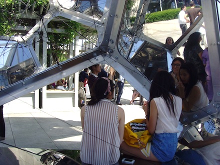 Physically, the installation spans a great 54 feet in length, 29 in width, and stands 28 feet tall. 16 irregular glass shapes linked at steel edges and joints build the dome-like body, while their reflective surfaces provide alternating views of the surrounding city. Visitors who wish to experience yet another perspective are able to climb up and through the structure on separate, timed tours.