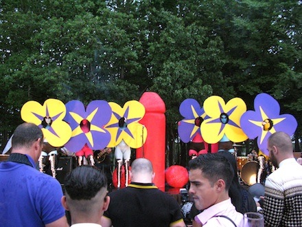 On the event’s main stage, set up behind the building, Paul McCarthy’s giant Butt Plug – a 60 foot inflatable rendering of the titular sex toy – swayed menacingly in the evening’s moody weather, a condition which effectively heightened the work’s power, turning the the sculpture into a performance of sorts. Guests crowded the silent auction tent, tippling and chatting, or braved the storm to explore the performances and installations in the surrounding woods, wandering a gravelly path flanked again by torches. Desi Santiago’s large-scale neon inflatable sculptures also helped to light the path, producing a Bruce Nauman-like sense of ominous humor. Santiago was recently lauded for his work in “Louis Vuitton Marc Jacobs”, at the Musée des Arts Decoratifs, Paris, where his subversive mannequin heads drew attention.