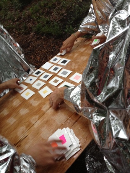 Masanao Hirayama’s performance piece Memory Master featured four anonymous figures clad in faceless, reflecting coverings feverishly playing a game of memory, their cards printed with simple squares of color. Mysterious and uncanny, the work was fittingly situated at a fork in the wooded path.