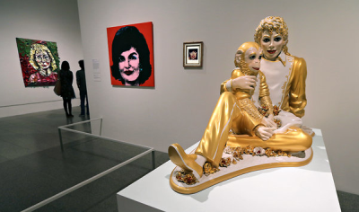 “Celebrity and Power” tackles Warhol’s involvement with portraiture and his fascination with celebrity. His iconic motifs of Jackie, Elvis, and Marilyn are exhibited side by side with Chuck Close’s sleek photo-realist canvas of the composer Philip Glass and Karen Kilimnik’s representation of Paris Hilton as the irreverent queen in Marie Antoinette out for a walk at her petite Hermitage, France, 1750. A glittering Diamond Dust Joseph Beuys is compared with the equally flashy Michael Jackson and Bubbles by Jeff Koons.