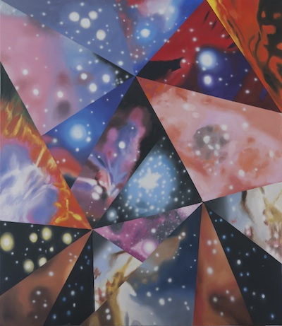 Rosenquist has long been recognized for incorporating fragmented pictoral images in his paintings, yet in his most recent works, abstractions, patterns, and astronomical motifs play heavily. This is no coincidence, as the artist, who grew up in Depression-era North Dakota, spent much of his childhood gazing at the Northern Lights, star showers, and solar winds of the Great Plains. The brush fire, inciting an existential quandary, left Rosenquist reflective, questioning his relation to the world, reality, and the perceptual, as well as the passage of time.