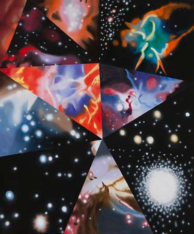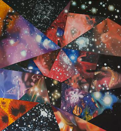 The exhibition features eleven paintings which grew out of Rosenquist’s response to his purpose as an artist. In his typical manner, Rosenquist combines, overlaps, and fragments his brilliantly colored abstractions, yet does so very jauntily, creating dozens of unique and disparate surfaces on the canvas. Working together, the abstract forms appear as if facets in a jewel, dictated by a fractal, or spawned from a crack in ice. The rhythmic patterns and celestial abstractions give rise to wholly organic pieces.