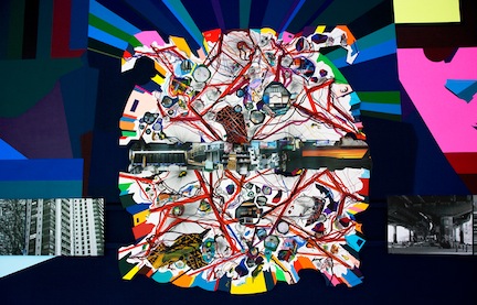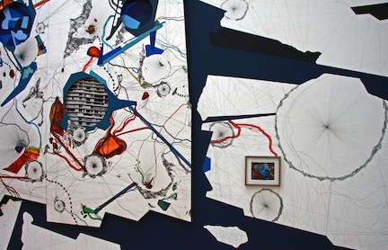 From a distance, the chaos is contained, even calm in its largesse. Asymmetrical faces and smiles appear in the shapes, suggesting Picasso’s intense, disjointed figures or Francis Bacon’s garbled portraits. The colors, paths, and urban textures recall Julie Mehretu’s Stadia paintings. Some viewers recognize anxiety in Ackermann’s work and describe a foreboding representation of global terrorism and degradation. Certainly a confrontation exists in this installation, but the contained center node, the distinct color blocks, and the confidence with which the realistic and the imagined spaces are represented is decidedly comforting, even uplifting.